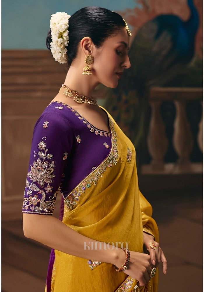 Drape yourself in timeless elegance with this exquisite yellow tissue silk saree, a celebration of craftsmanship and grace. The luminous fabric flows effortlessly, creating a soft sheen that enhances its regal charm while maintaining a light, airy drape.
