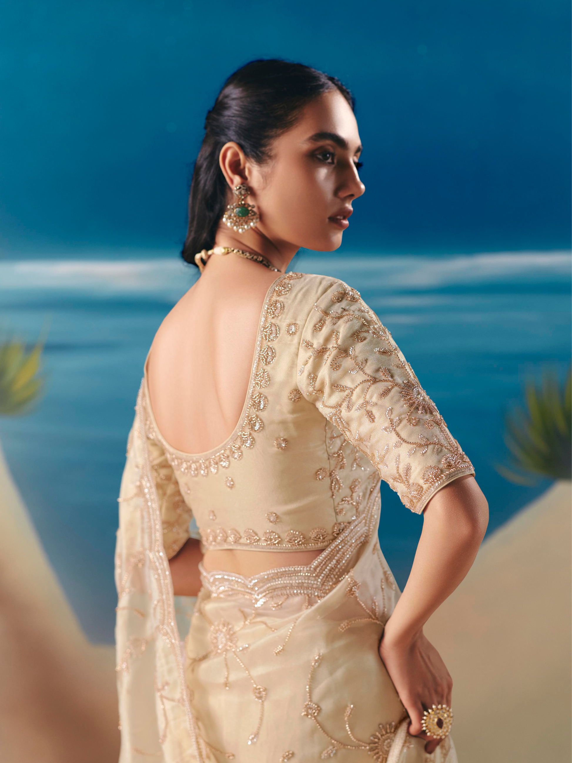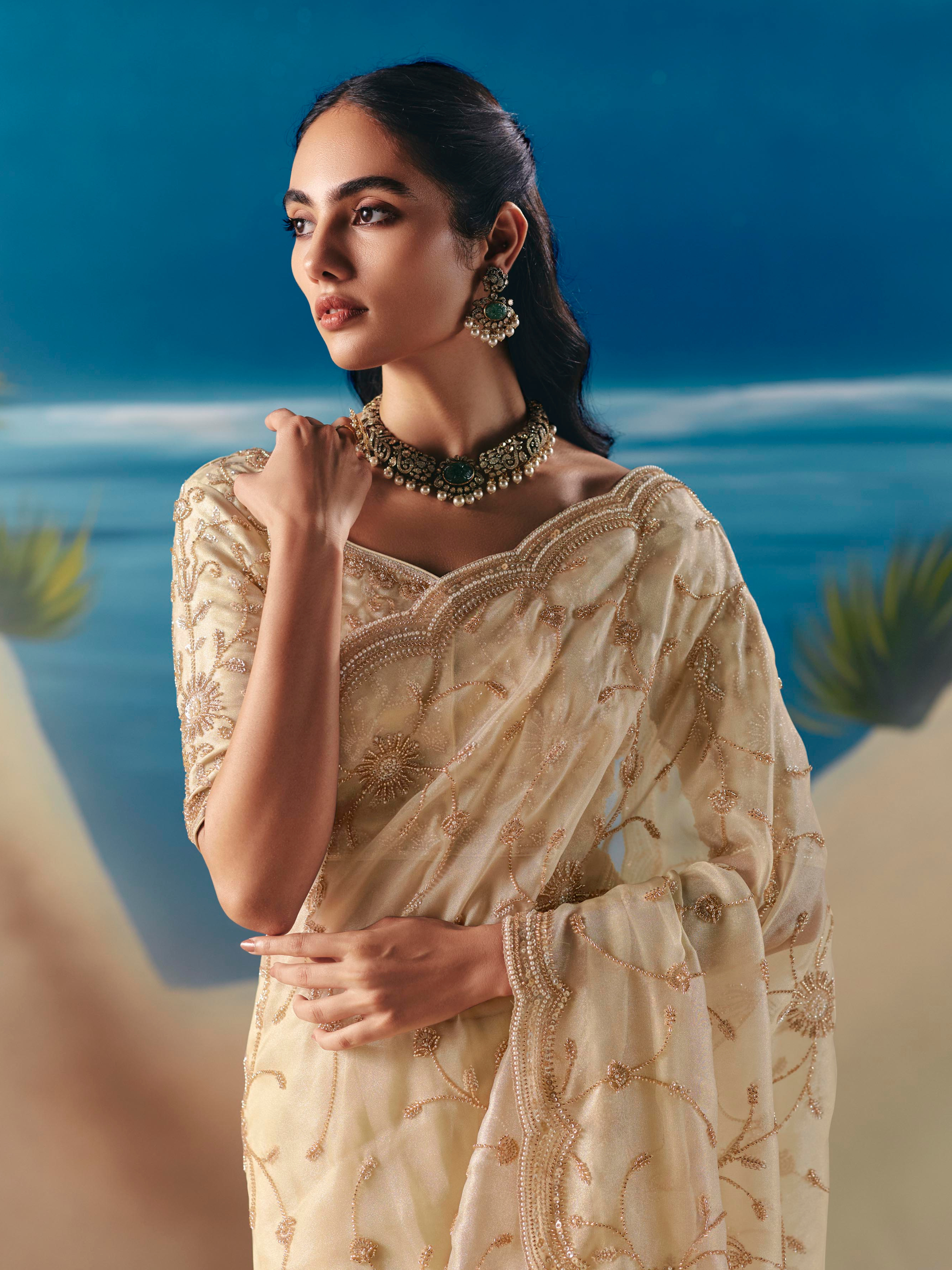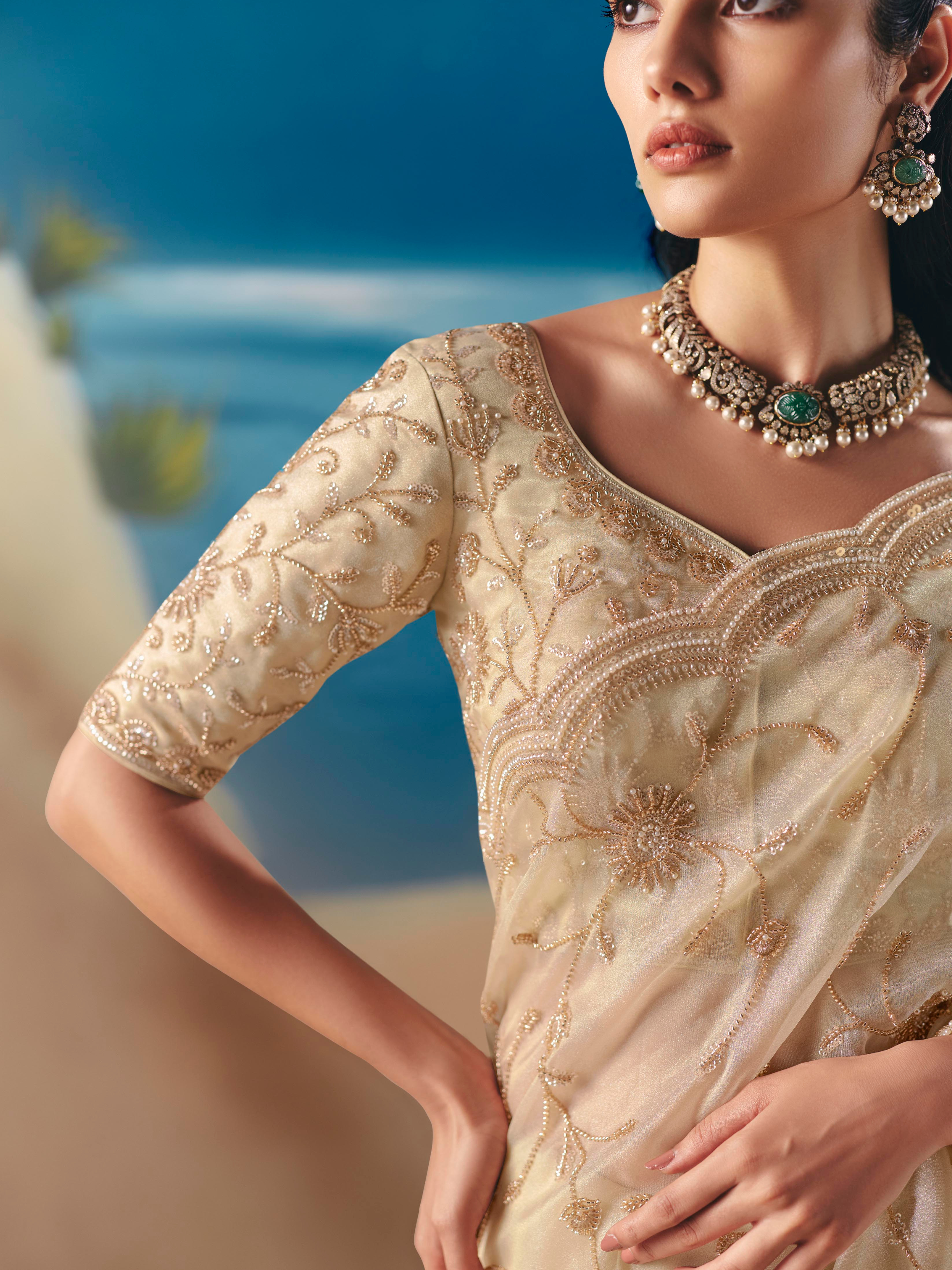 - Beige Organza Tissue Silk Hand Embroidered Bridal Saree