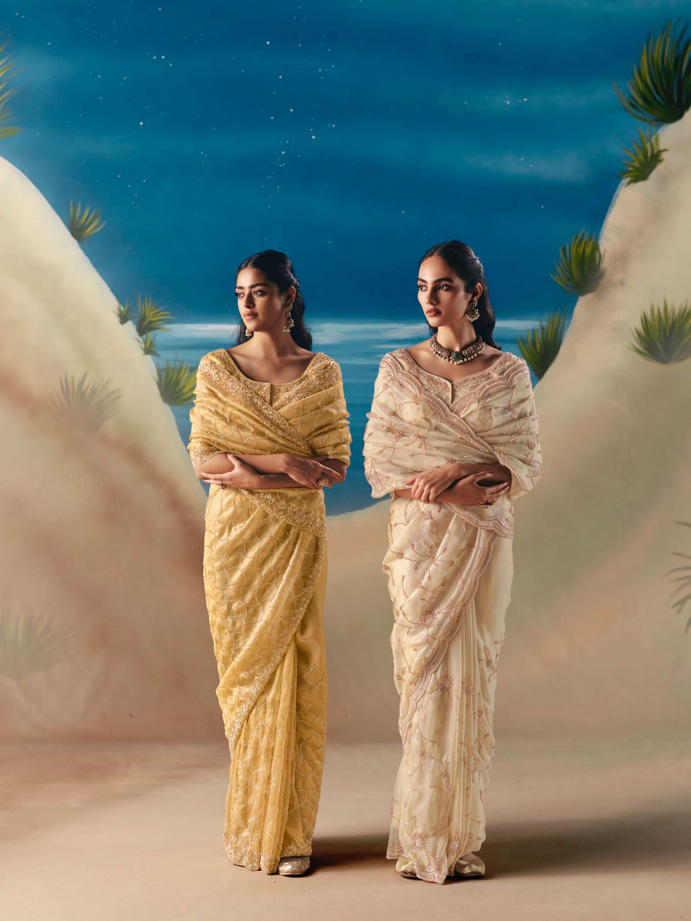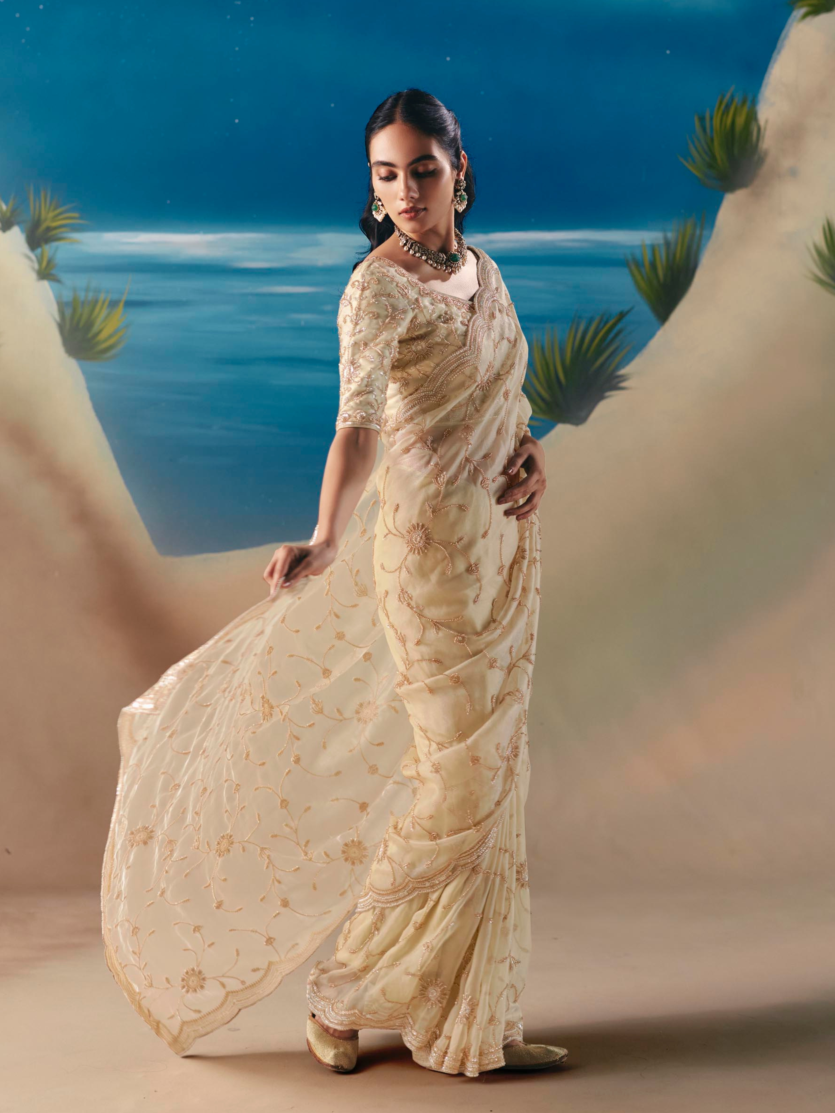 Lavished with fine beads, cutdana, tilla and sequence work, the entire drape features