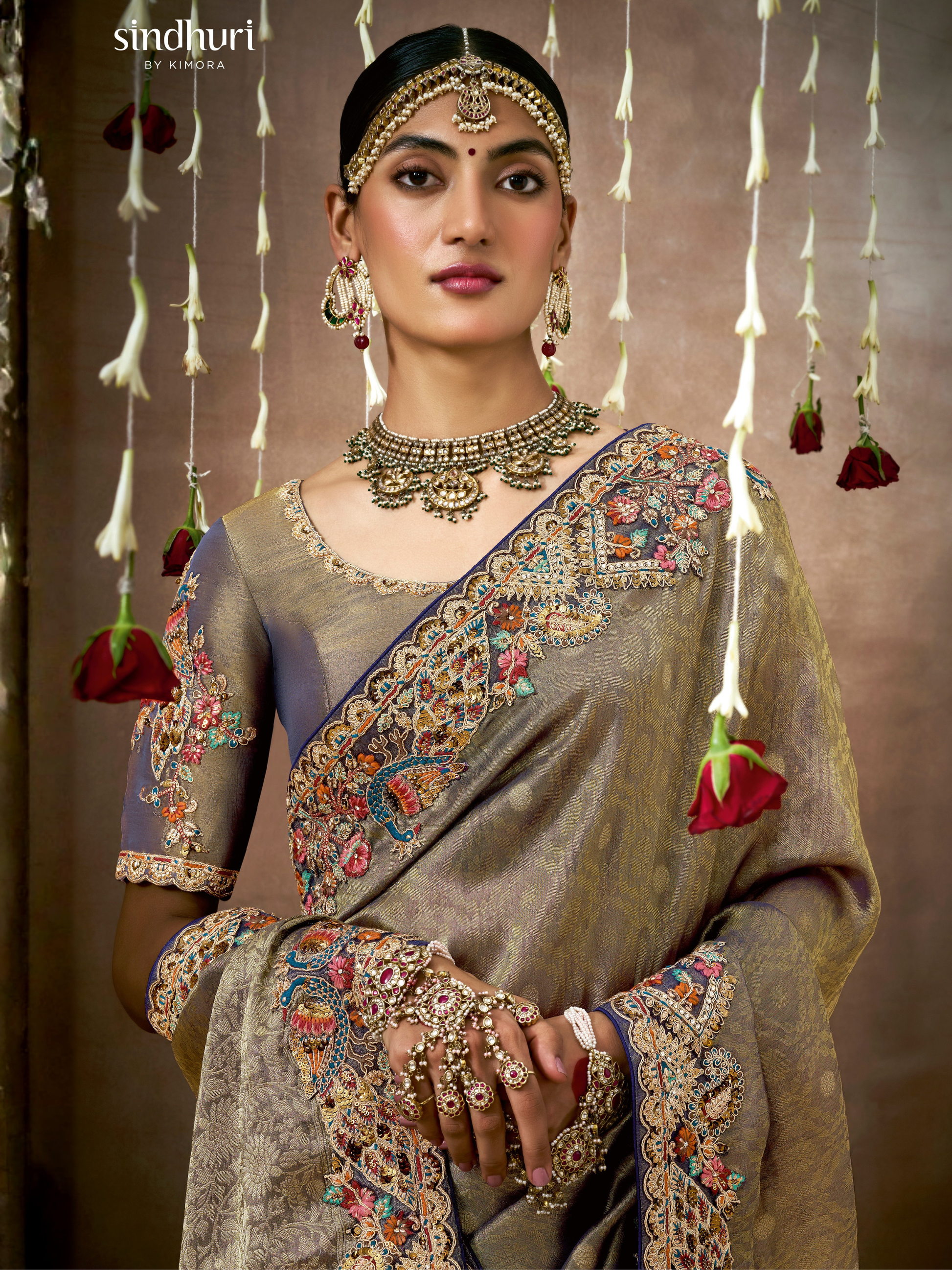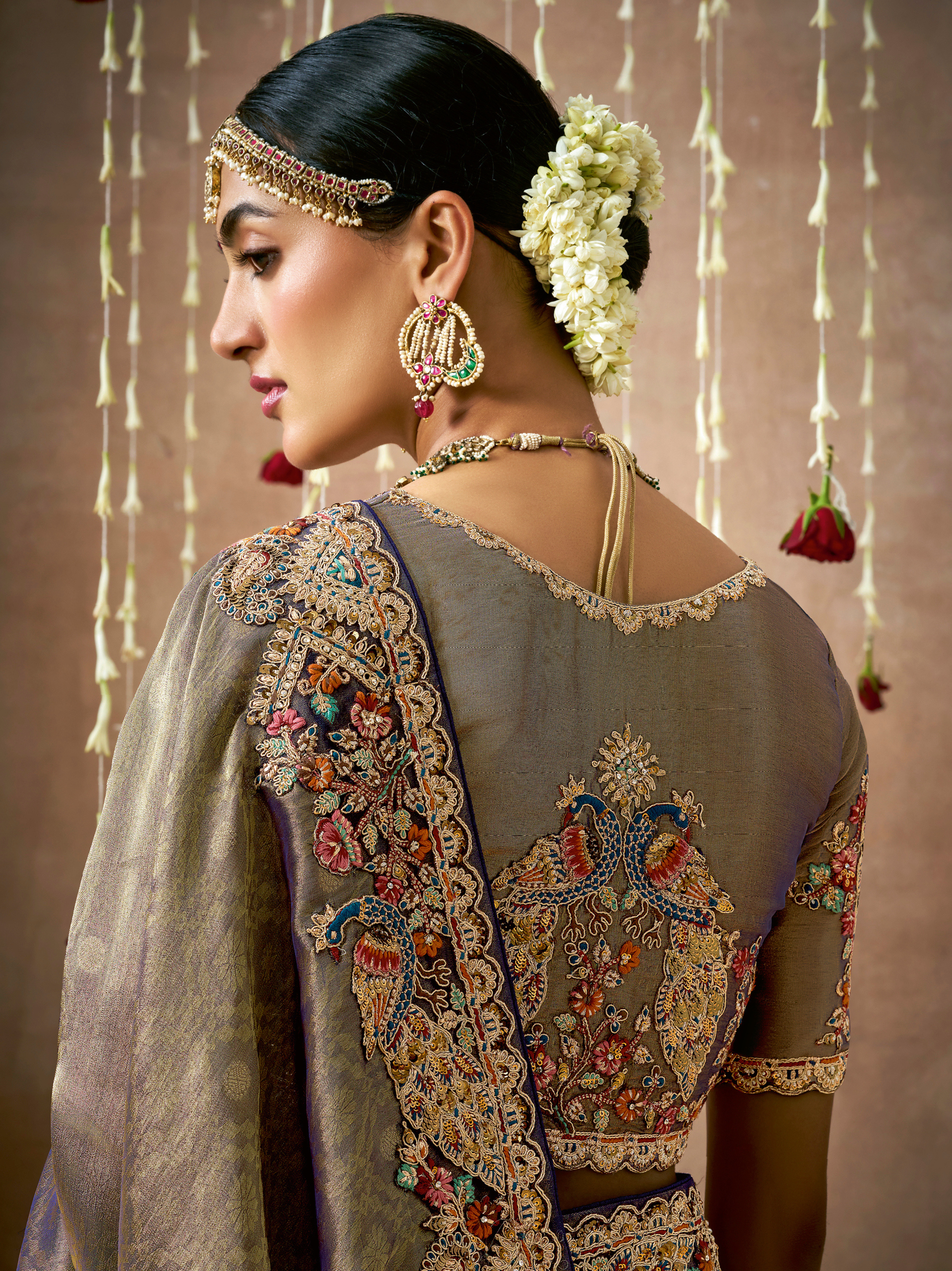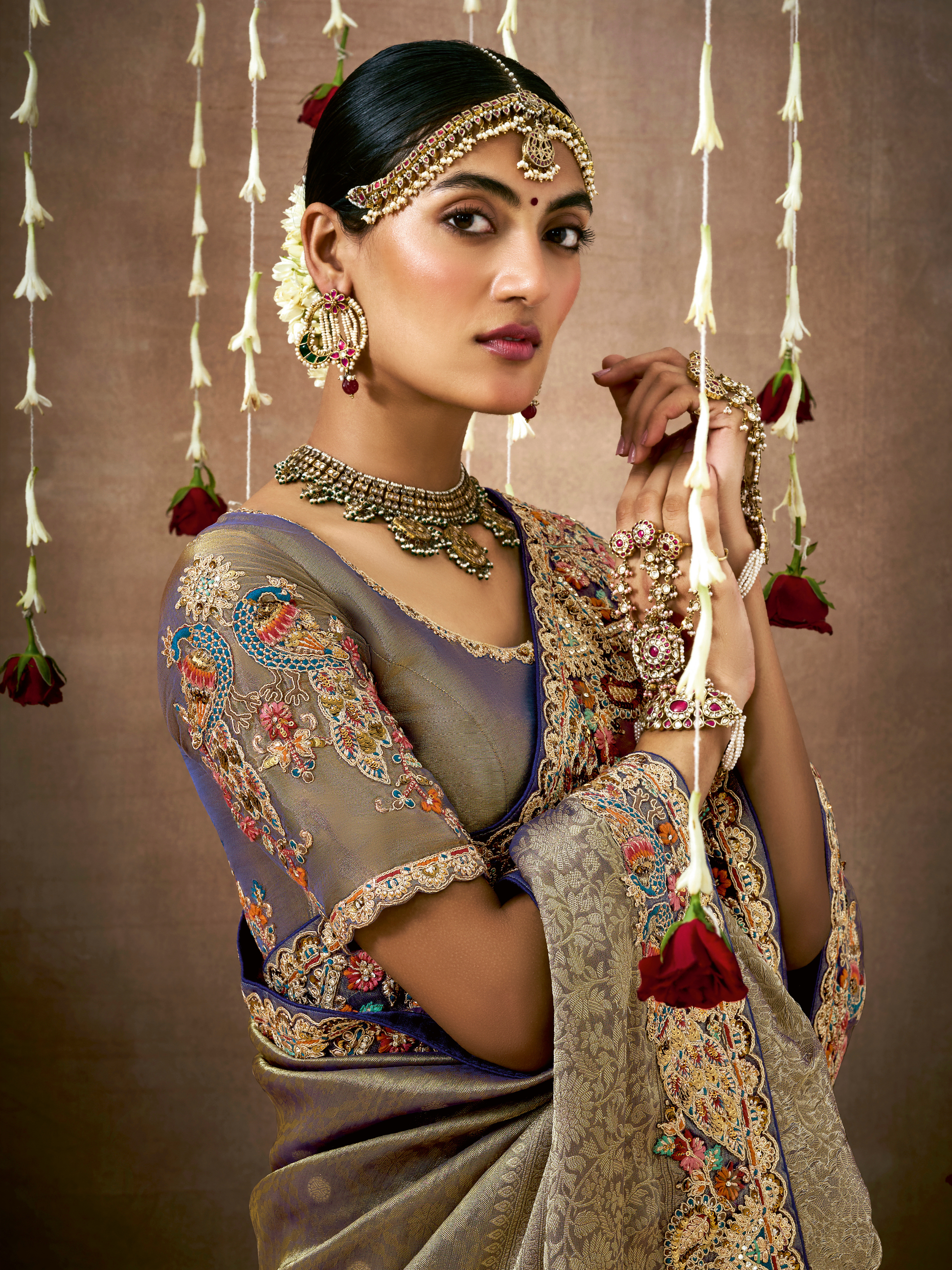 - Royal Aubergine Kanjivaram Silk Saree with Smoky Taupe Blouse