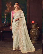 The soft ivory silk saree features luxurious golden embroidery, floral patterns, and shimmering sequin accents that create a regal, ethereal look. The highlight is the perfectly crafted scalloped border, designed to elevate your festive or bridal appearance.