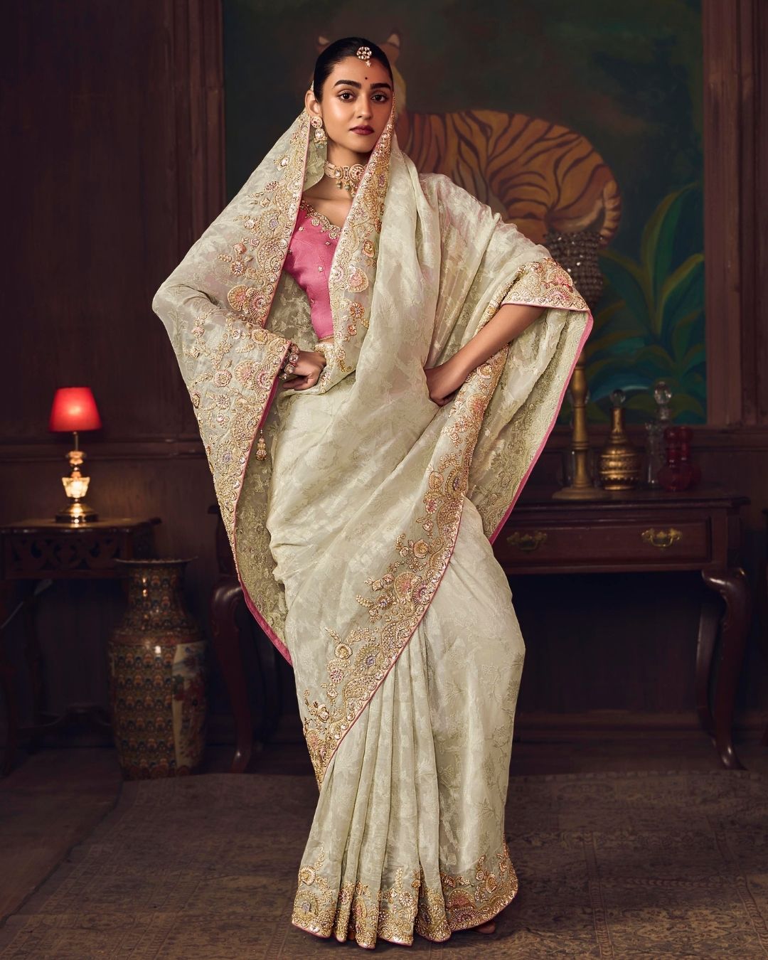 This exquisite saree from Kimora Fashion blends timeless elegance with modern craftsmanship.