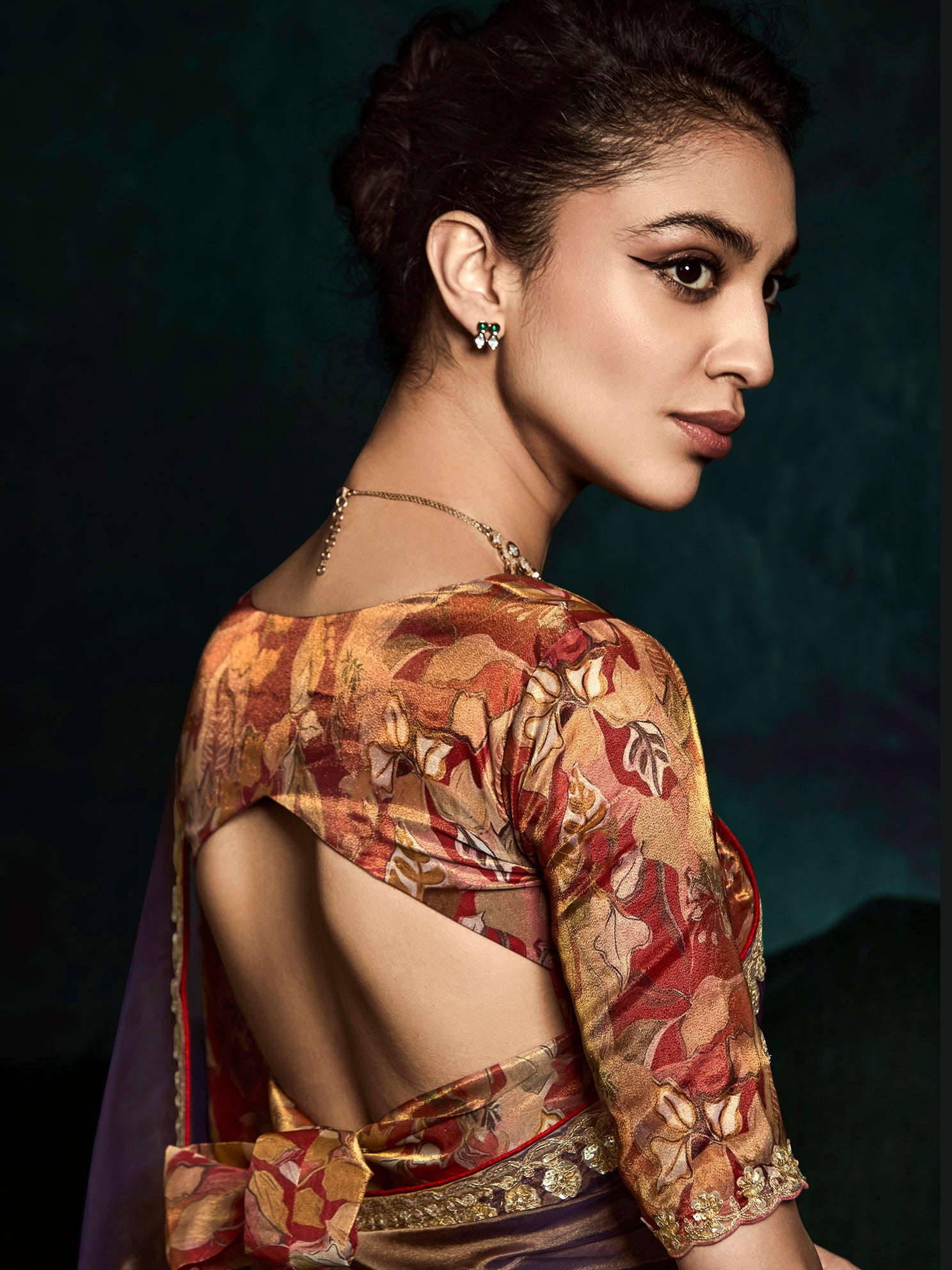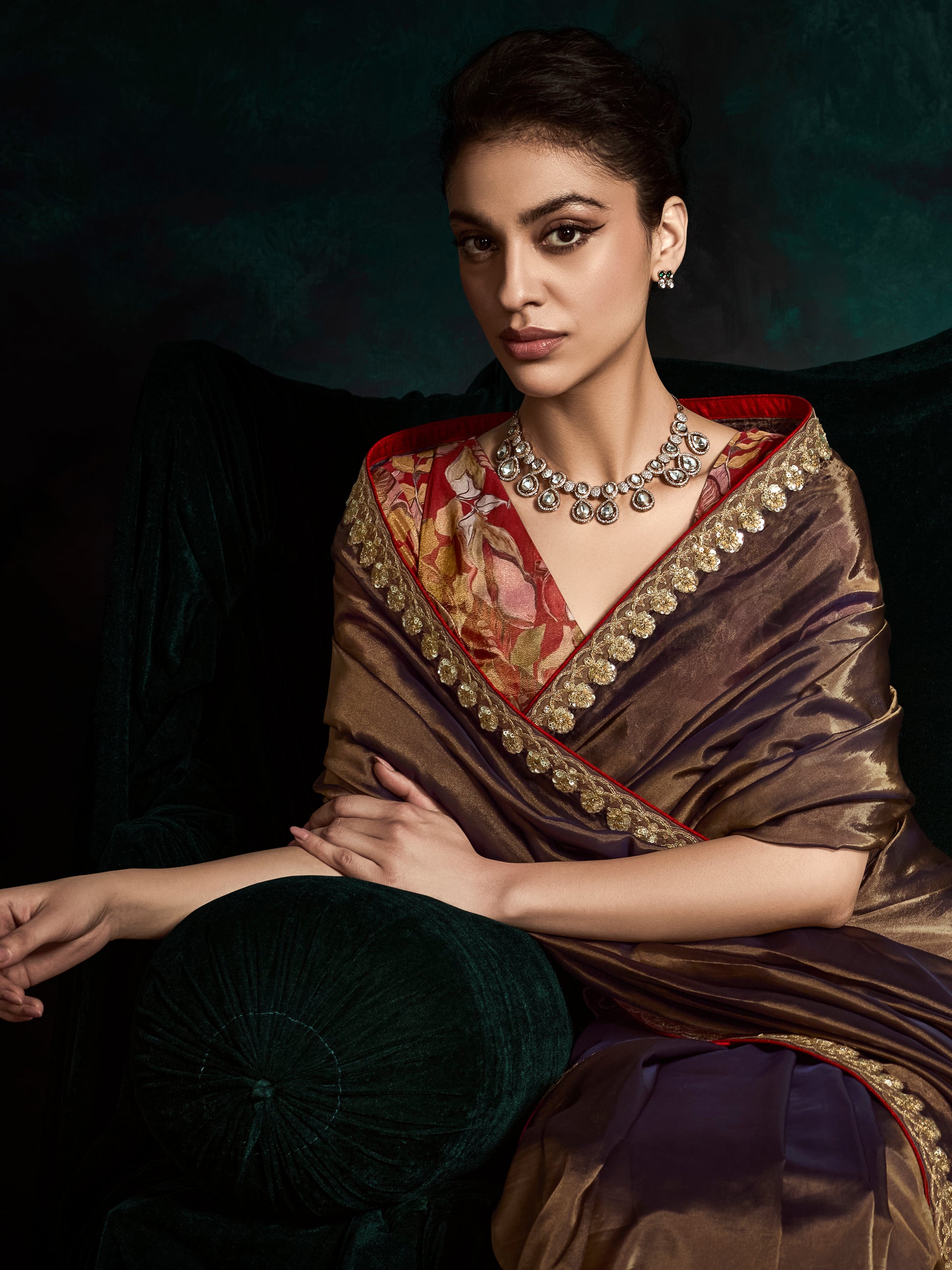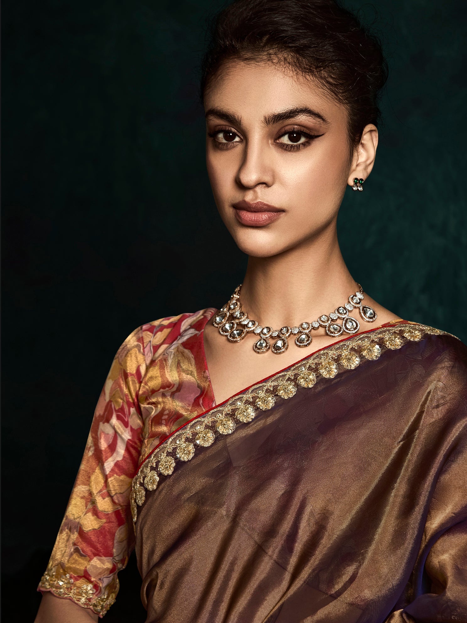 Elegant Brown Tissue Silk Saree with Crush Effect & Designer Printed Silk BlouseElegant Brown Tissue Silk Saree