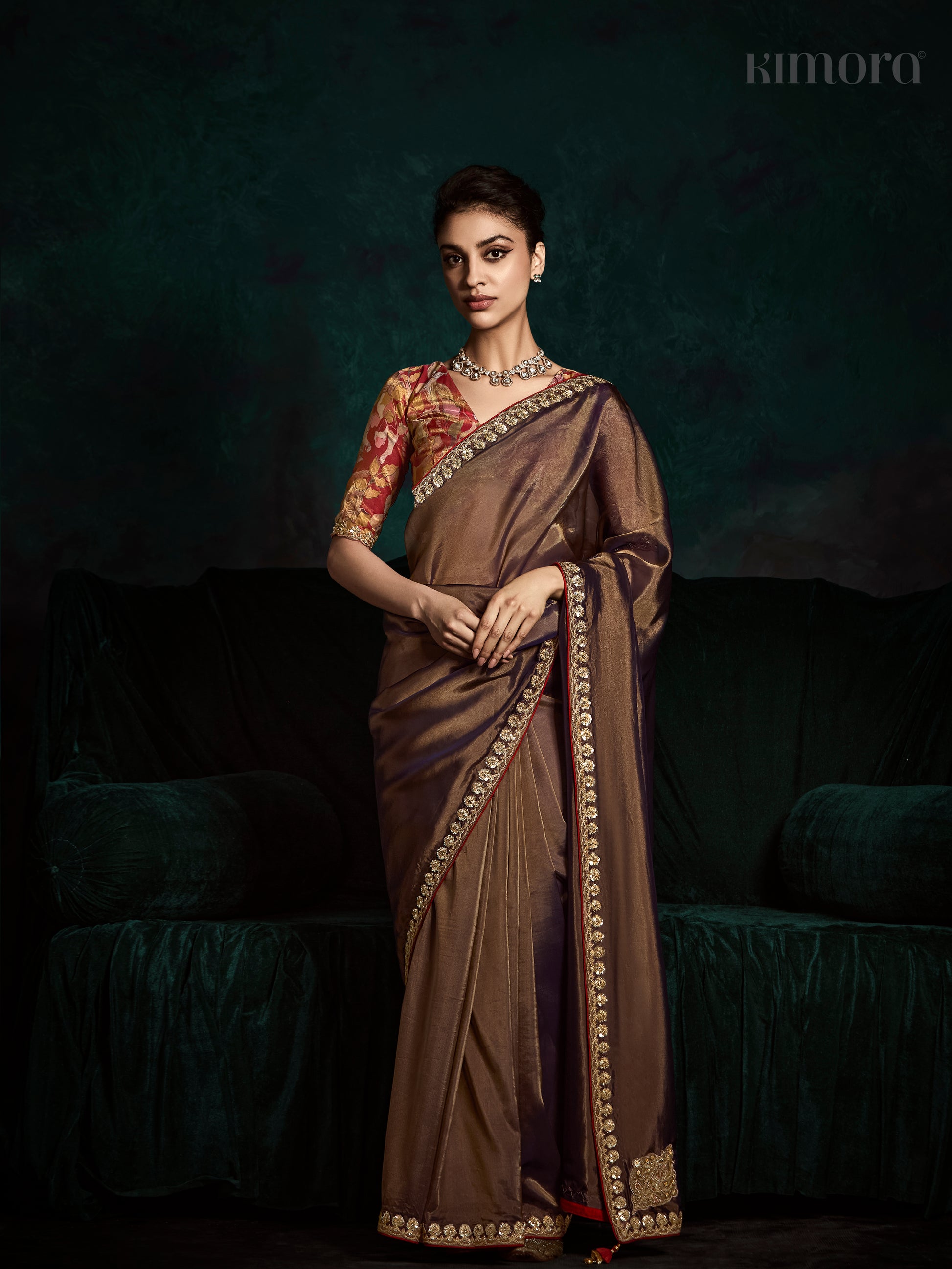 - Elegant Brown Tissue Silk Saree with Crush Effect & Designer Printed Silk BlouseElegant Brown Tissue Silk Saree