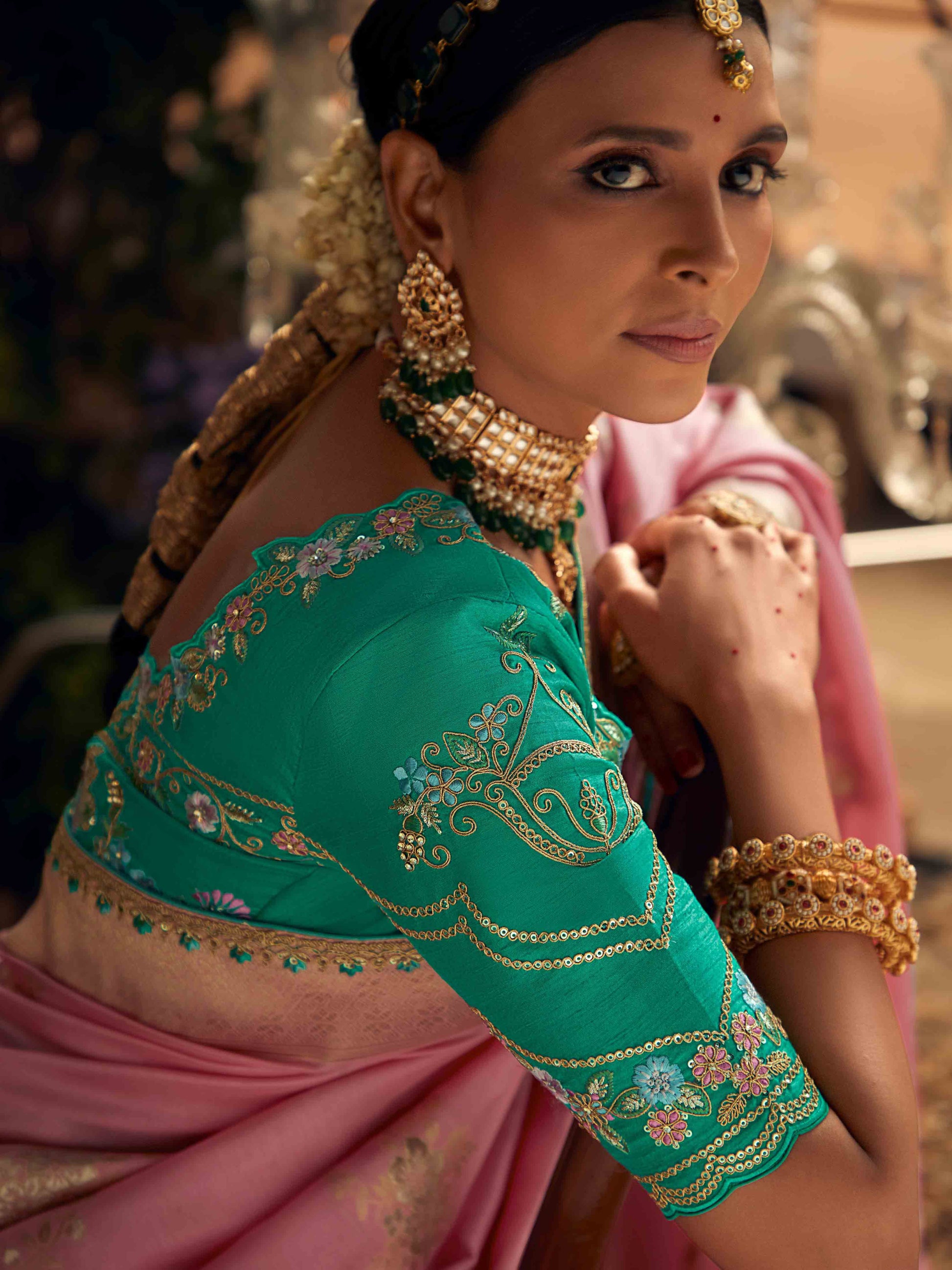 The soft blush pink hue exudes sophistication, while the contrast green blouse piece adds a vibrant twist, making the combination stand out beautifully. Whether you're attending festive occasions, weddings, or cultural celebrations, this saree ensures you make a graceful statement.