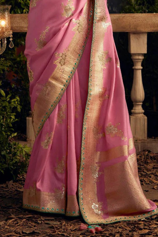 Grace meets charm with this stunning Pink Viscose Dola Silk Saree, designed to bring out your inner elegance. The saree is crafted from premium quality Viscose Dola Silk, known for its lightweight drape, silky texture, and subtle sheen, offering both comfort and grandeur.