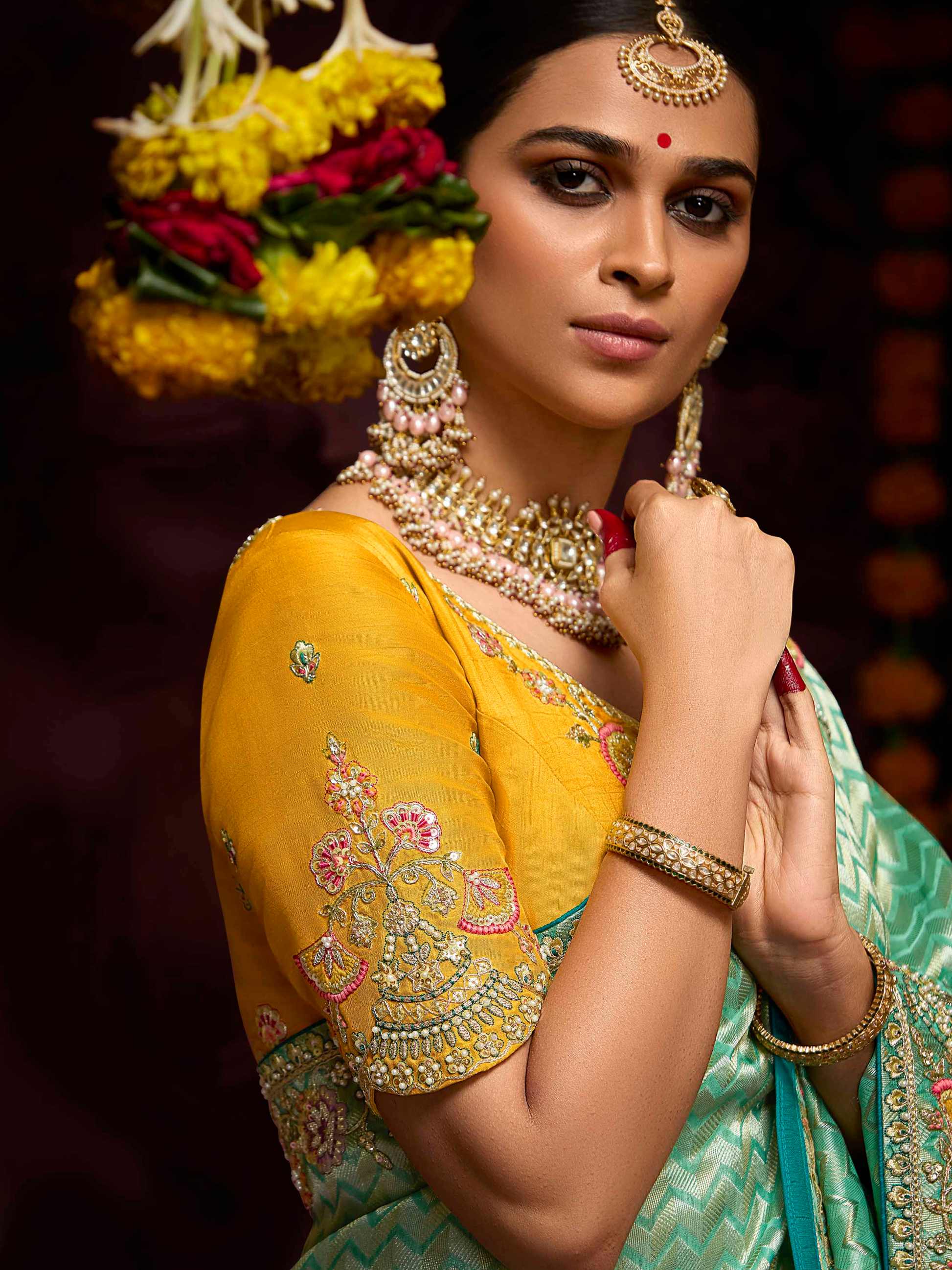 Whether you’re walking into a wedding, attending a festival, or celebrating a special moment, this Sea Green Banarasi Silk Saree promises to make you the center of attention with its effortless charm and exquisite craftsmanship.