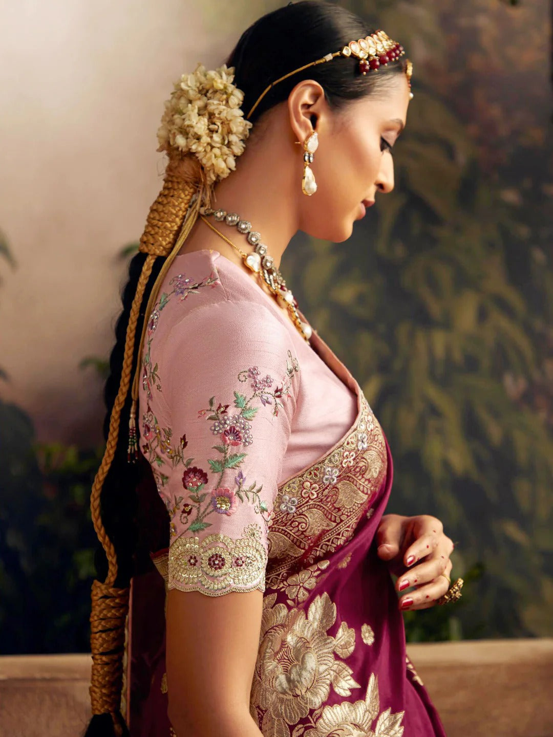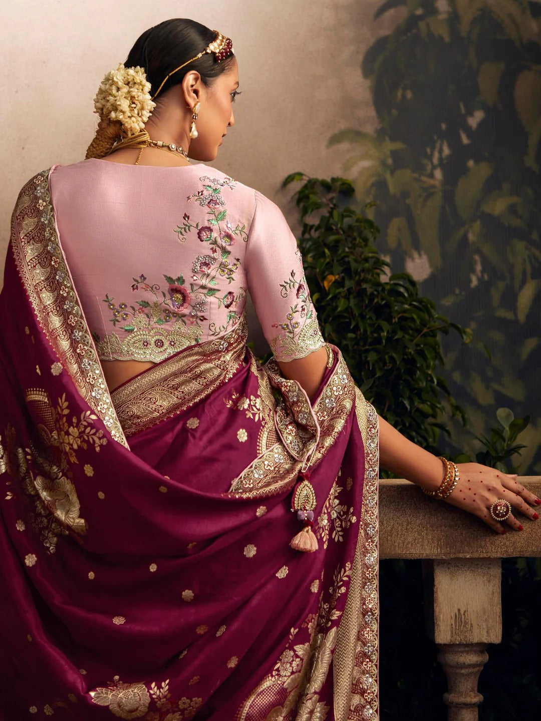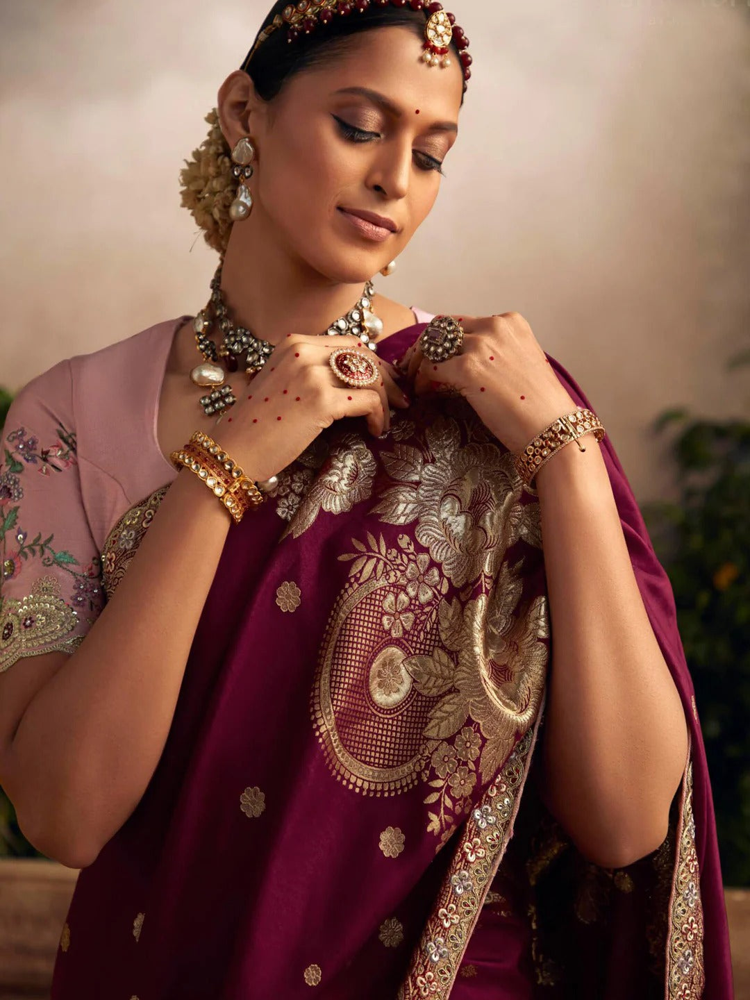 Embroidered Pure Viscose Dola Silk Purple Traditional Bridal Saree