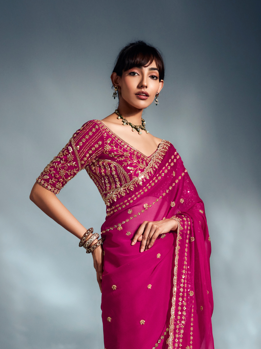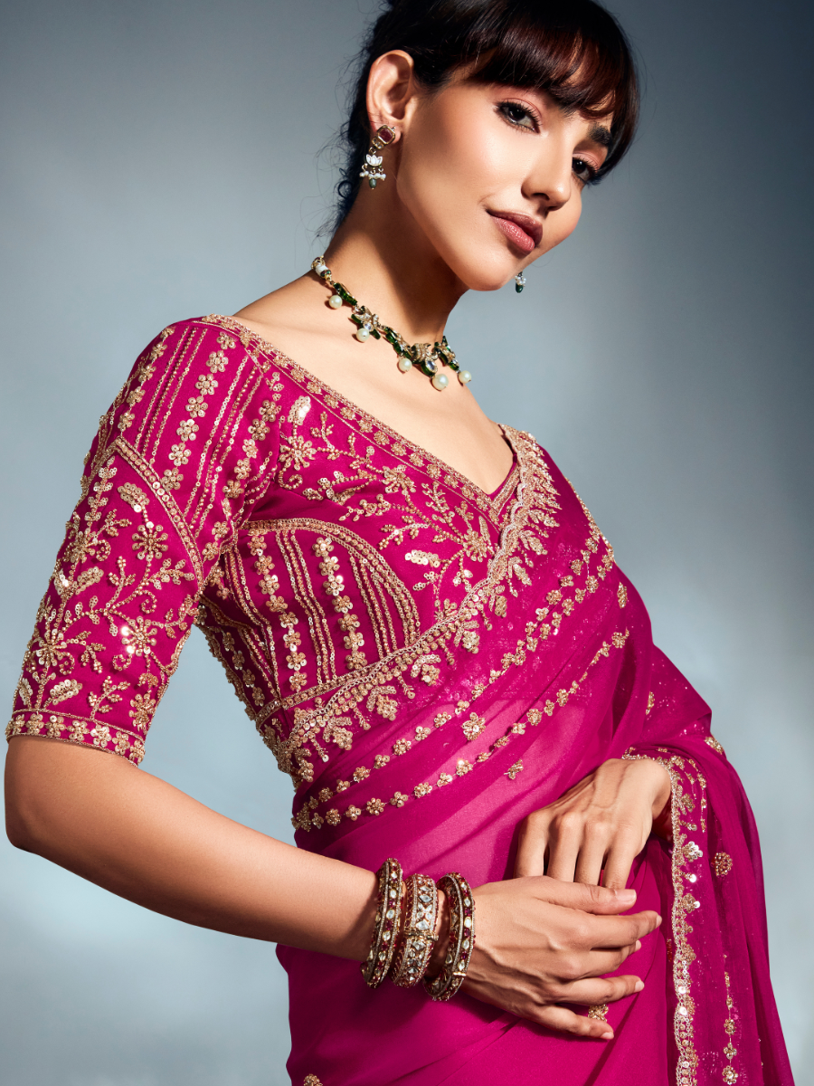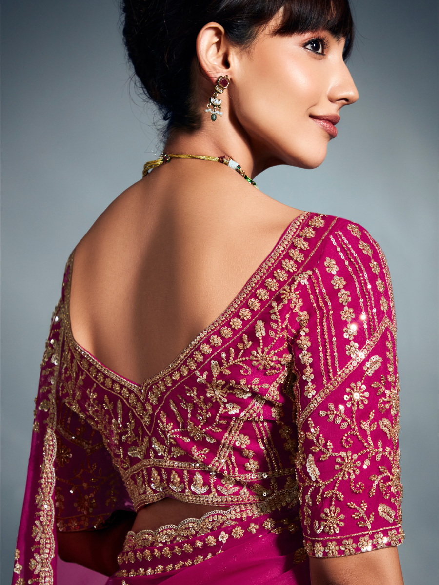 Paired with a heavily embroidered matching blouse, this saree showcases intricate craftsmanship, making it perfect for weddings, receptions, festive celebrations, and special occasions. The soft sheen of organza combined with detailed handwork creates a look that is both modern and regal.