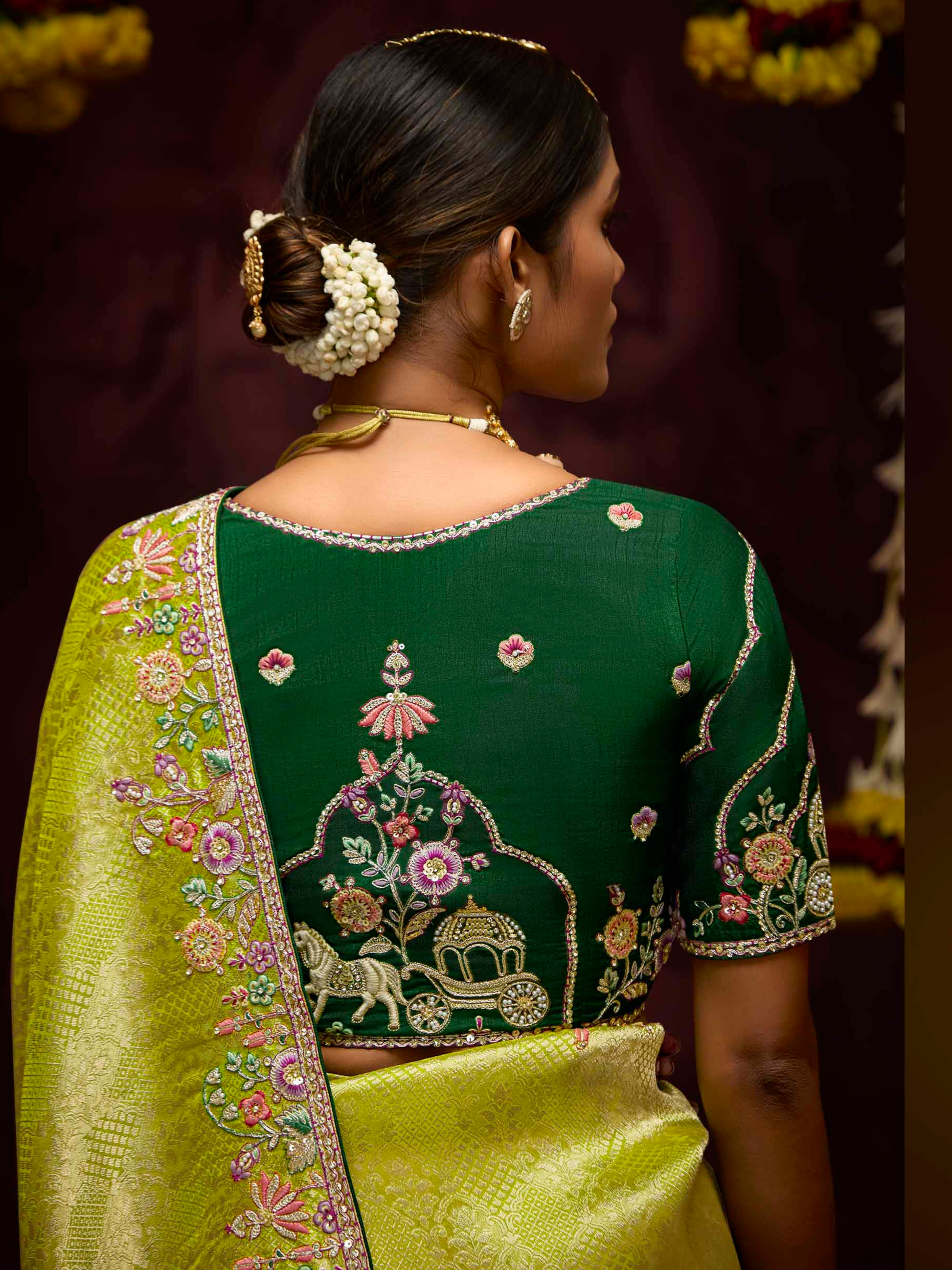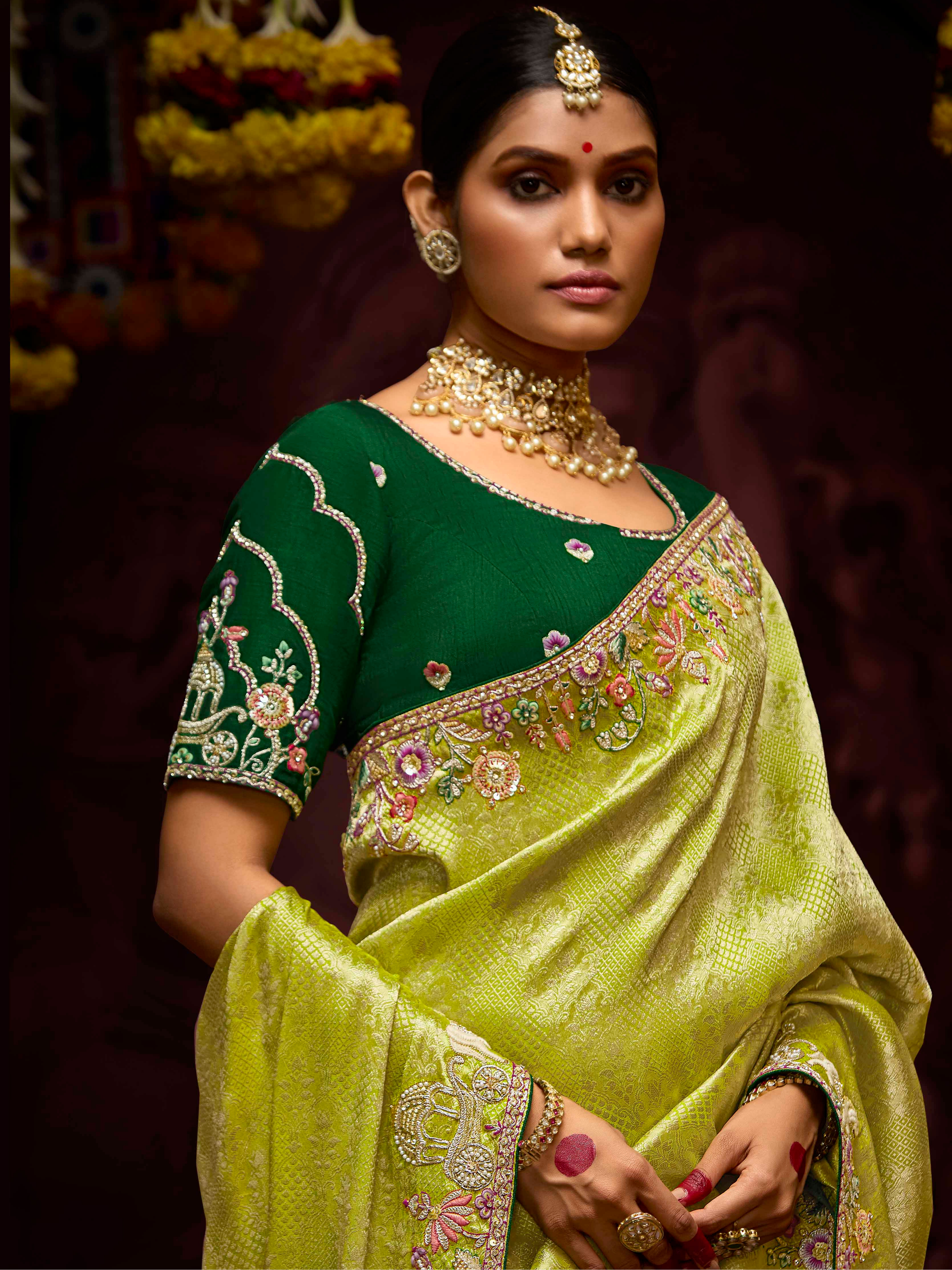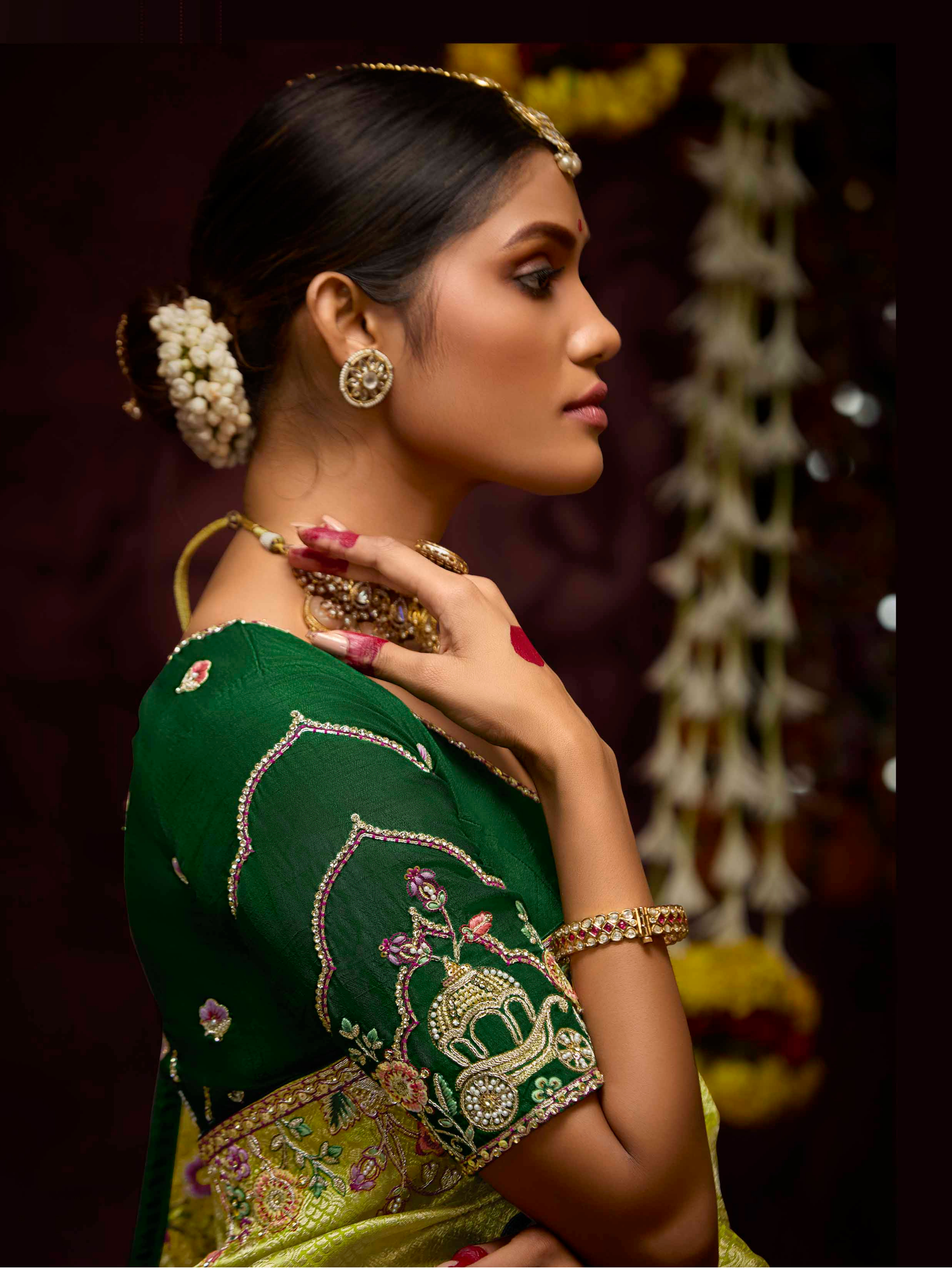 A viscose tissue silk self-weave texture green color sari, dark green blouse.