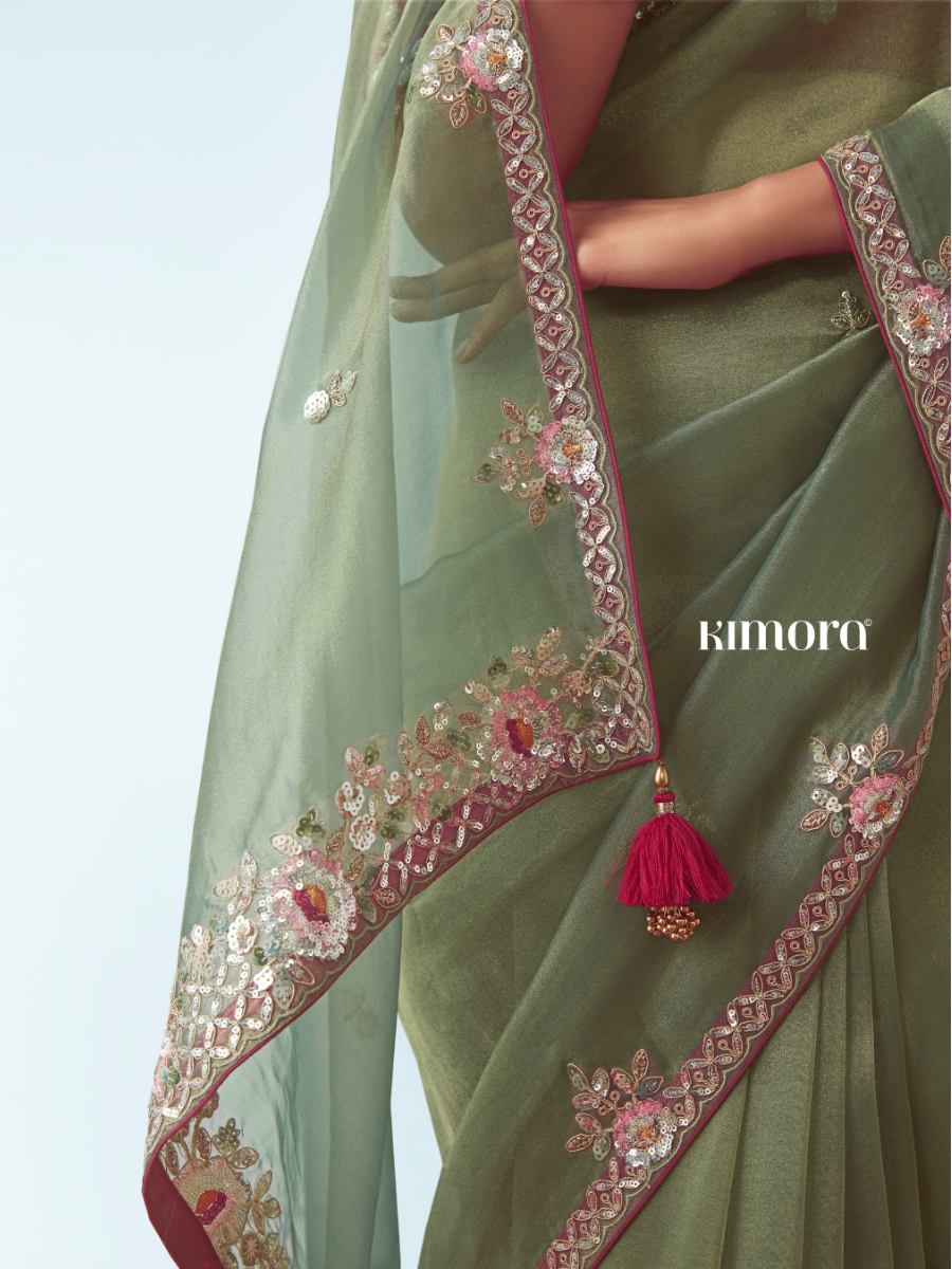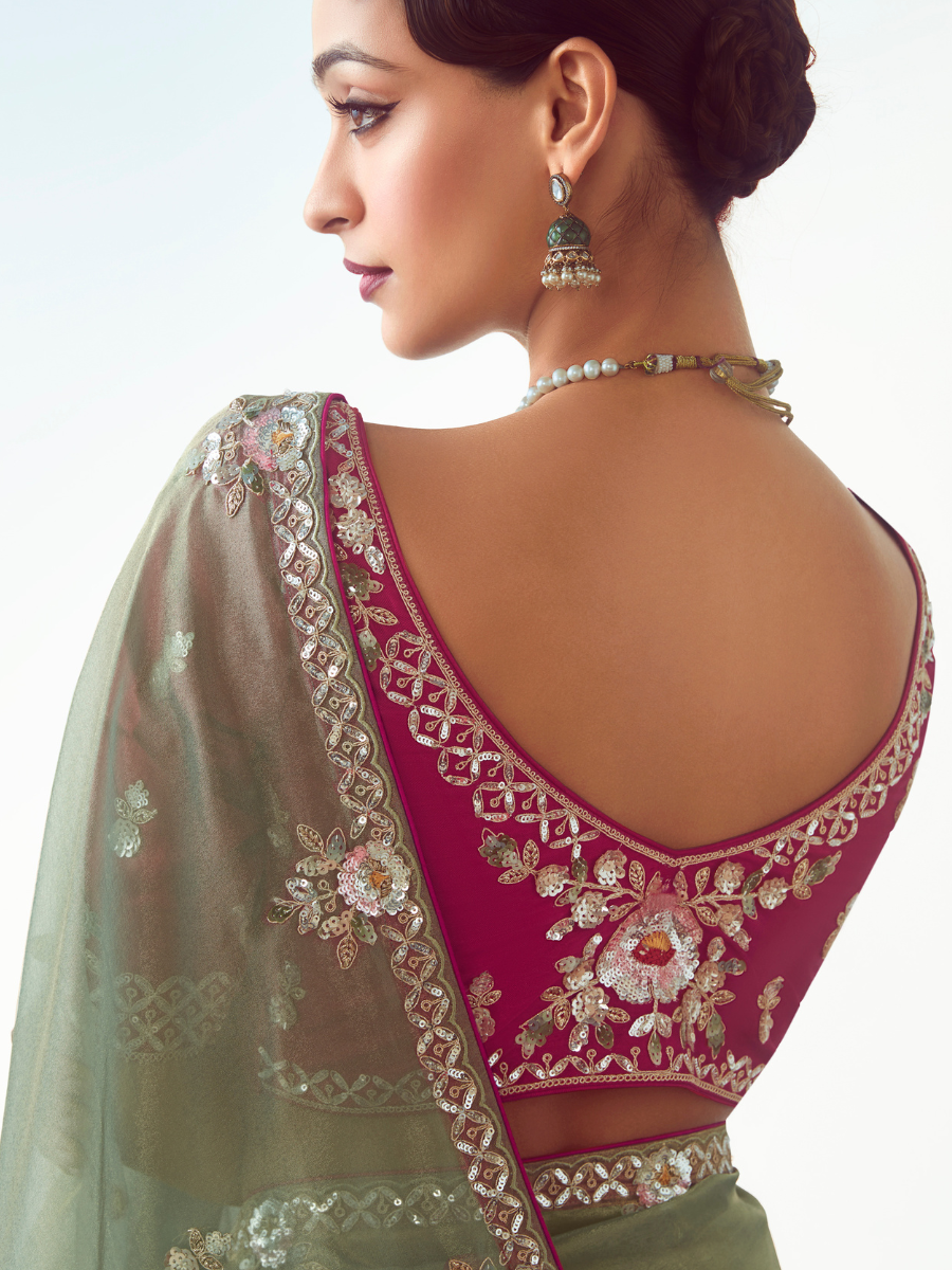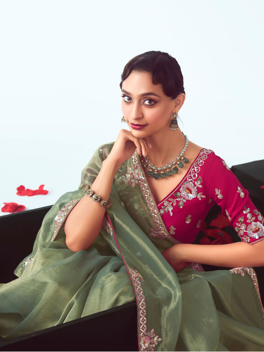 Green Organza Saree with Pink Embroidered Blouse