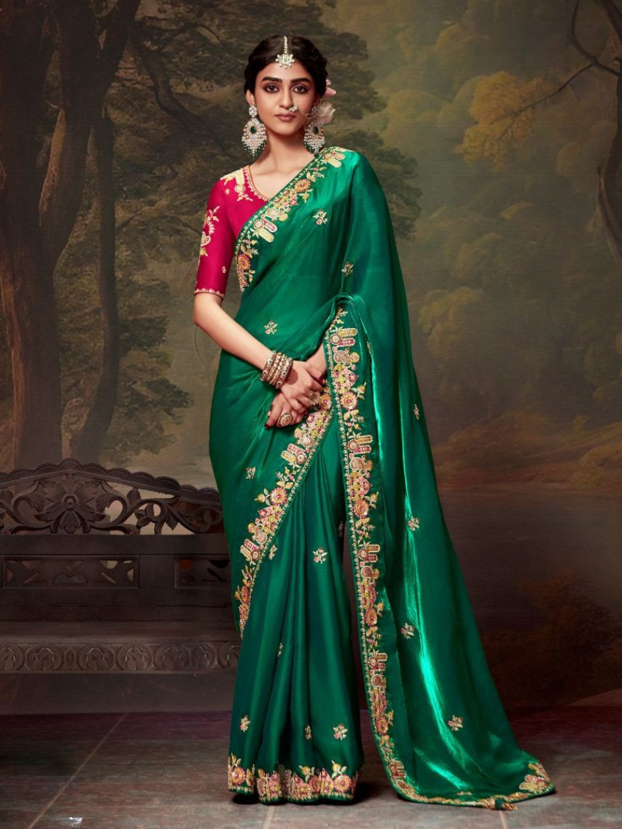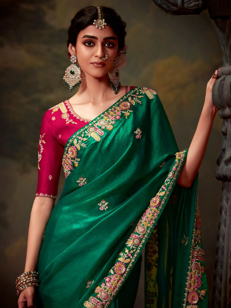- Green Silk Saree with Heavy Embroidery and Contrast Pink Blouse