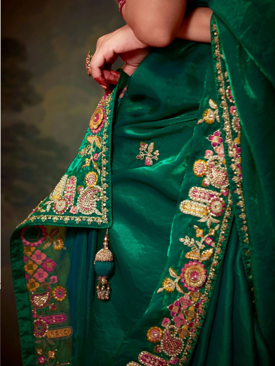 This green silk saree is a stunning option for wedding occasions, festive events, and traditional celebrations. The fabric has a rich silk shine, making the saree look royal and graceful. The embroidery work is beautifully done along the border and scattered motifs across the saree give it a premium and designer look.