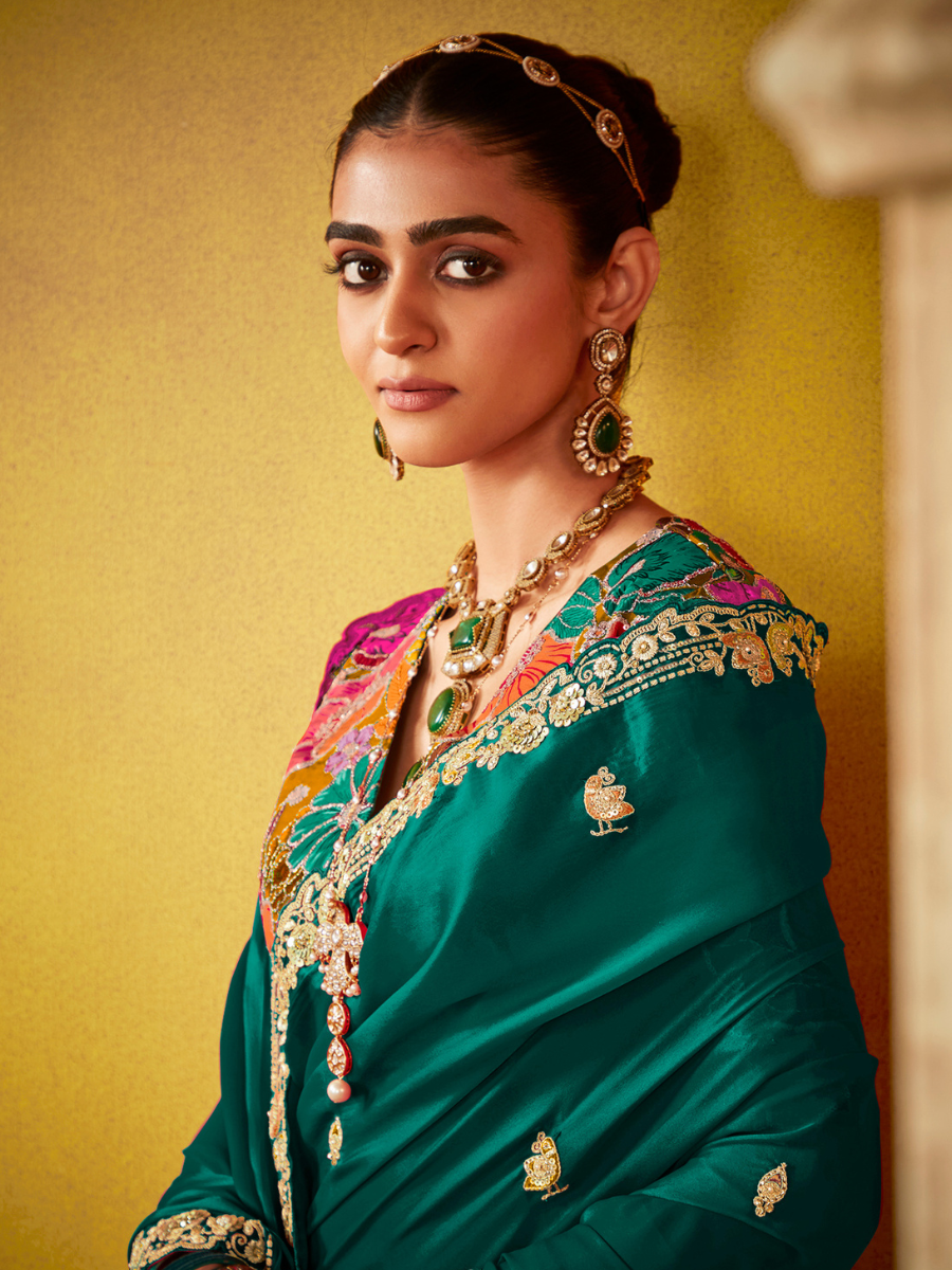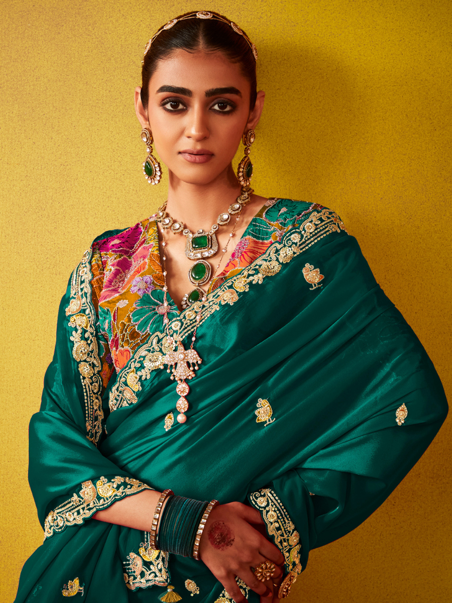 - Green Tissue Silk Saree with Embroidered Border and Floral Contrast Blouse