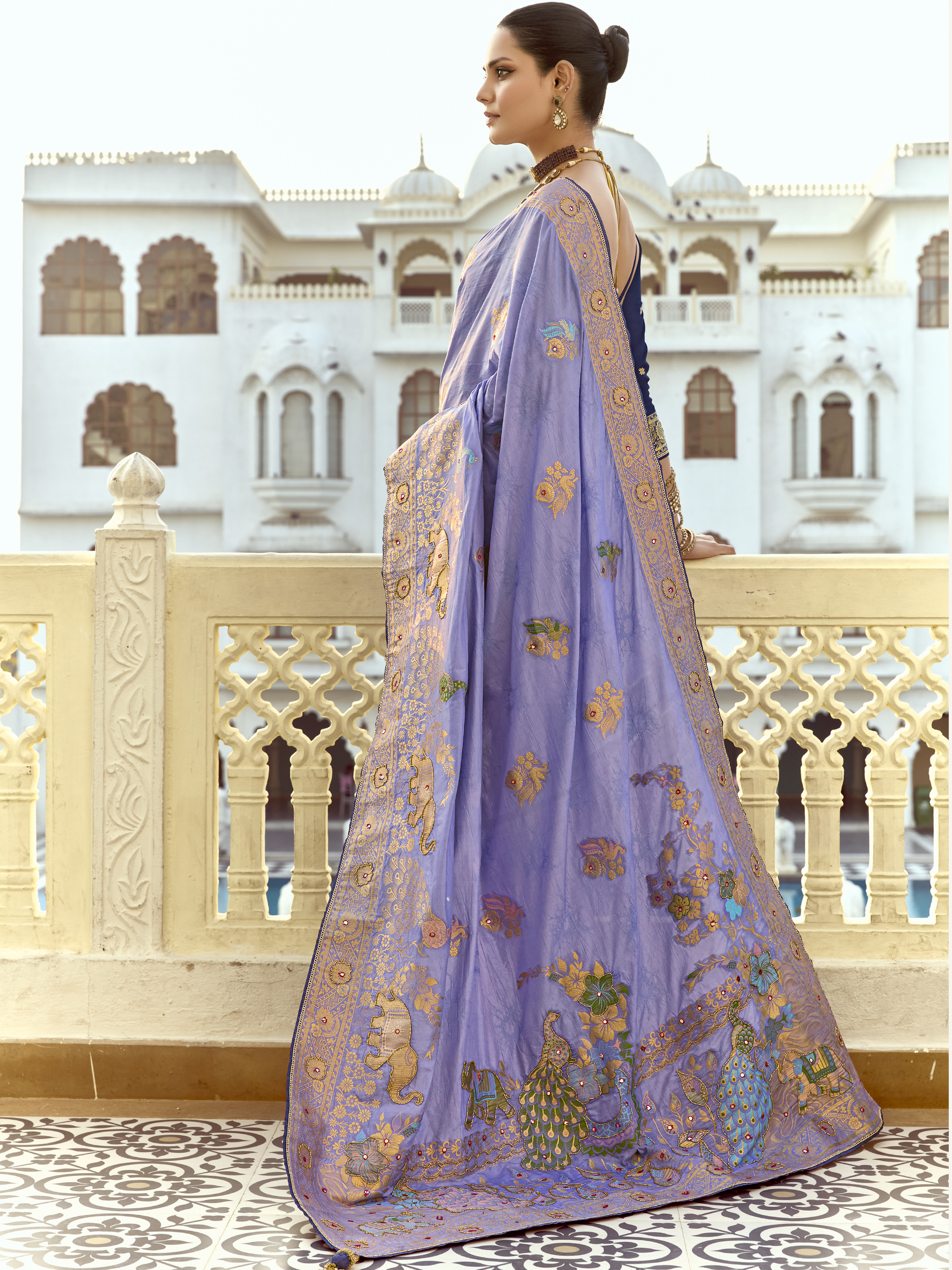 - Lavender Banarasi Silk Saree with Blue Blouse