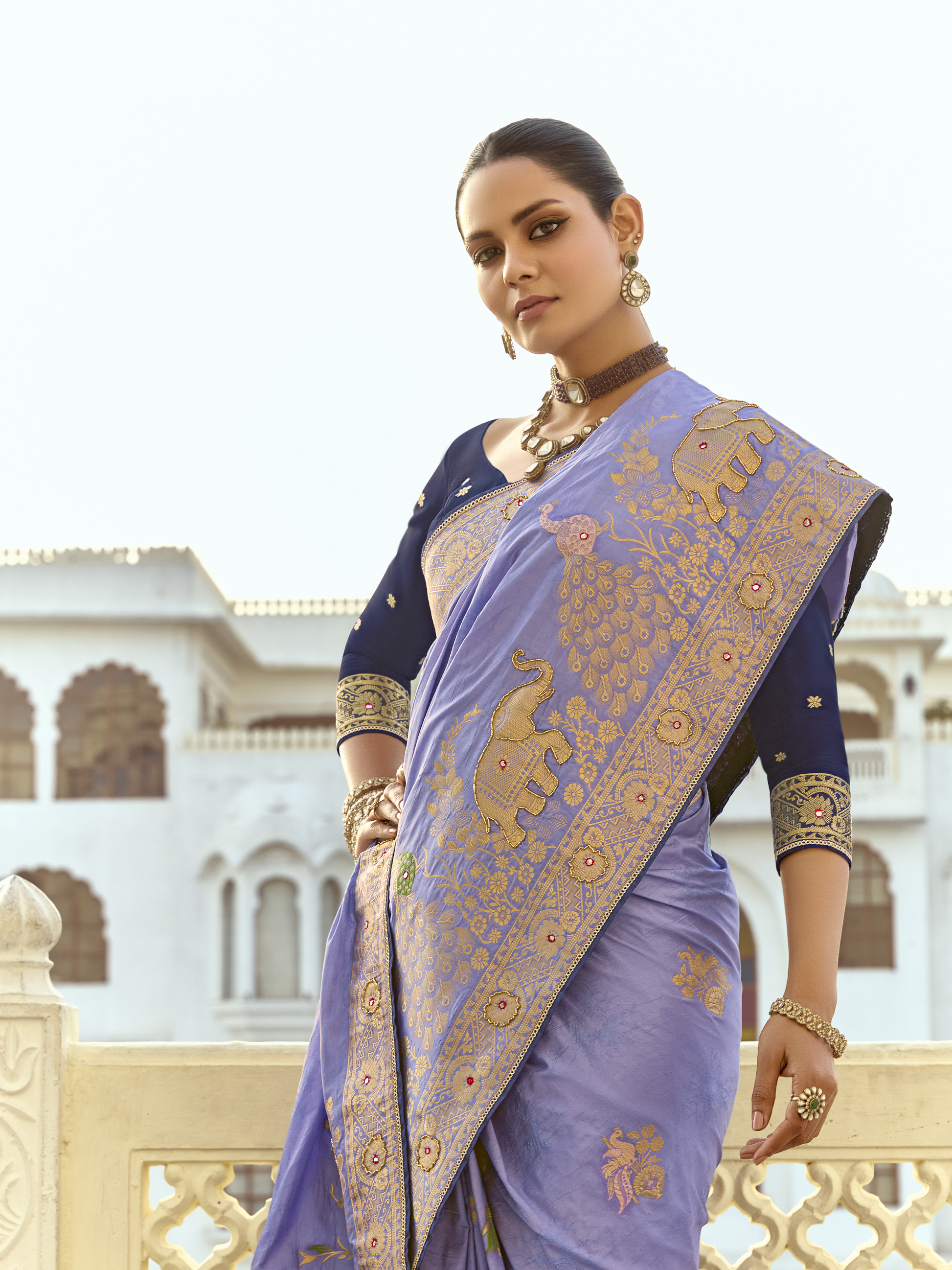 Shop this elegant Lavender Banarasi Silk Saree featuring golden Zari work and intricate elephant & peacock motifs, paired with a vibrant Blue Contrast Blouse. Perfect for weddings, festivals, and grand occasions.