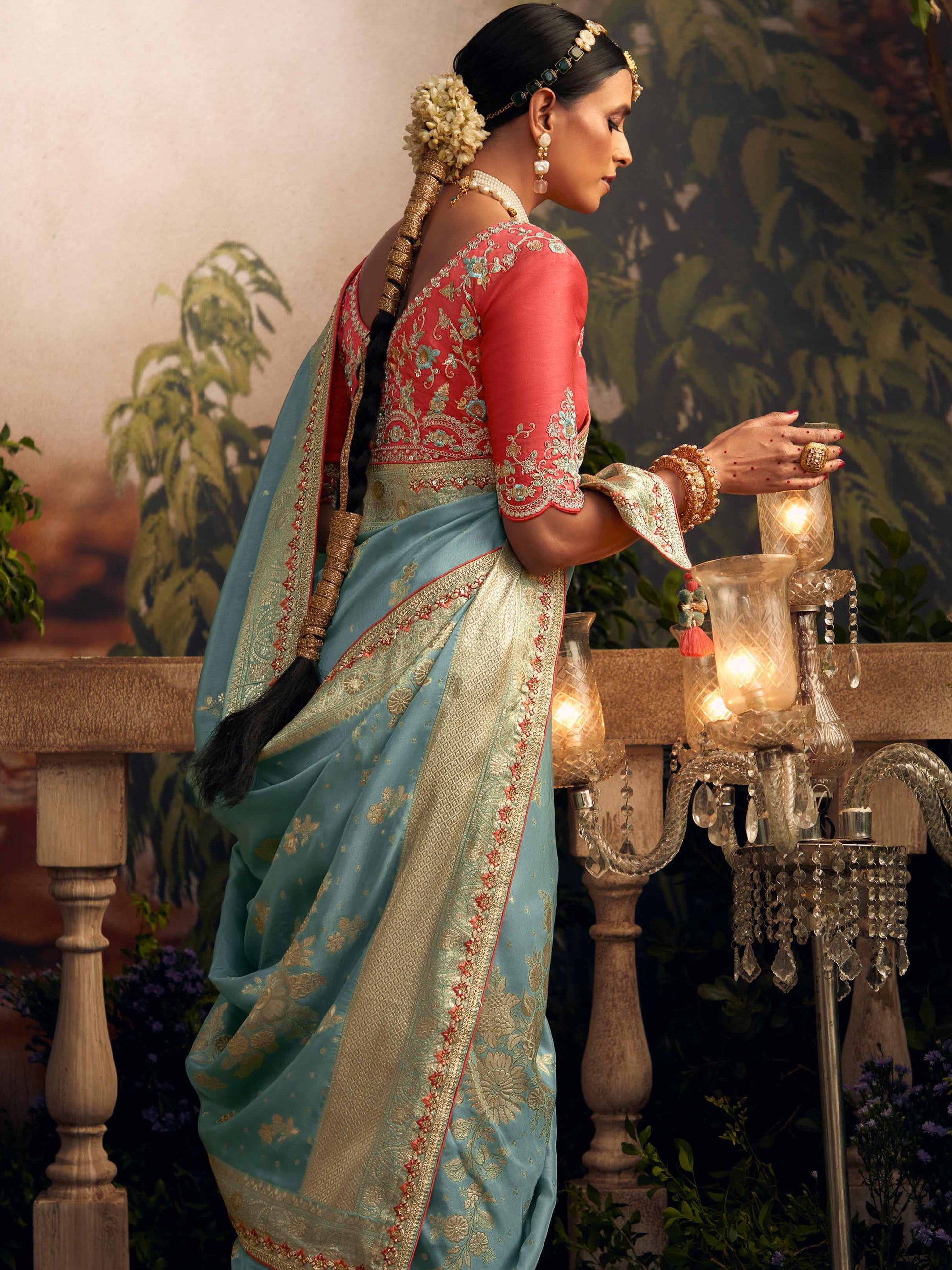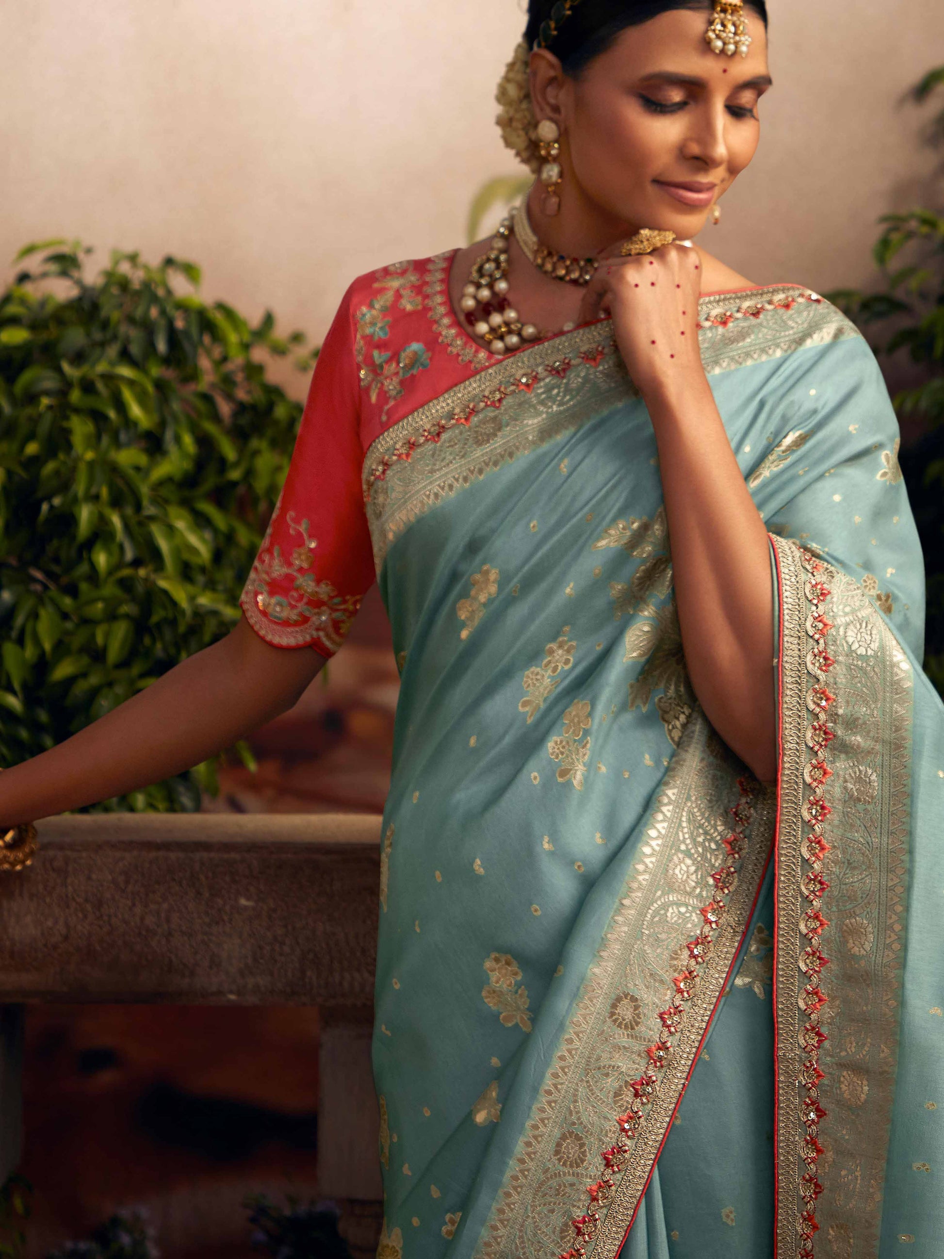 Light Blue Silk Zari Weaved Saree with Broad Border & Red Embroidered Blouse