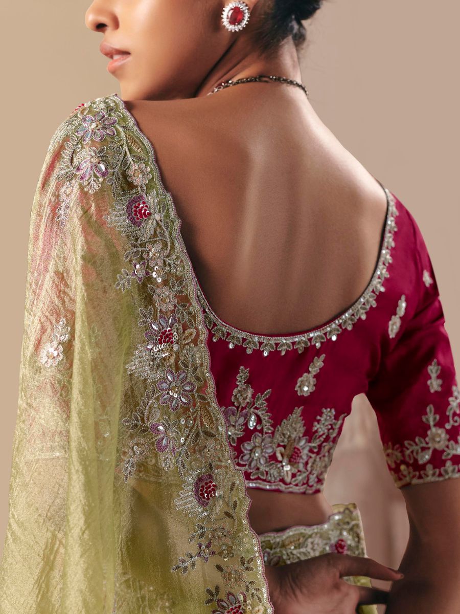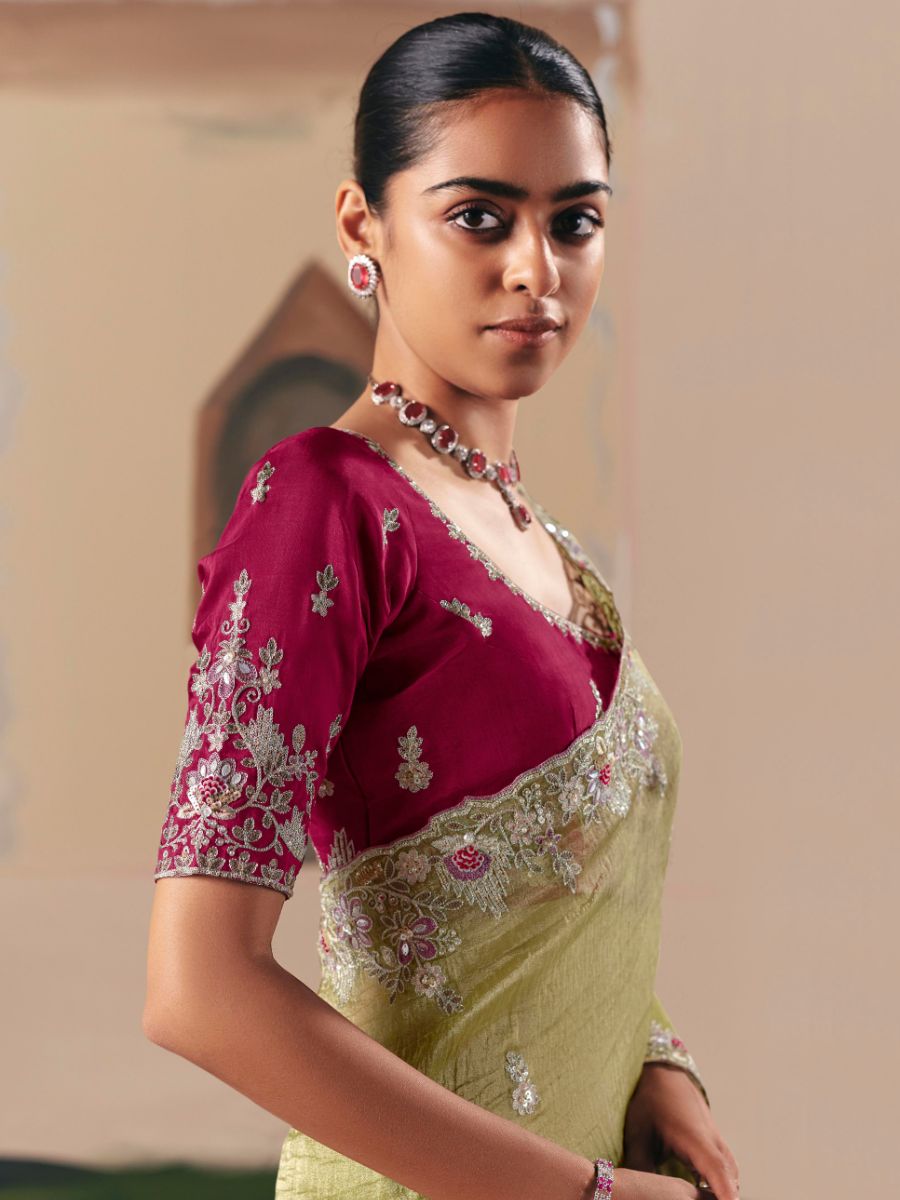 - Light Green Fancy Fabric Saree with Thread & Sequin Work and Maroon Blouse