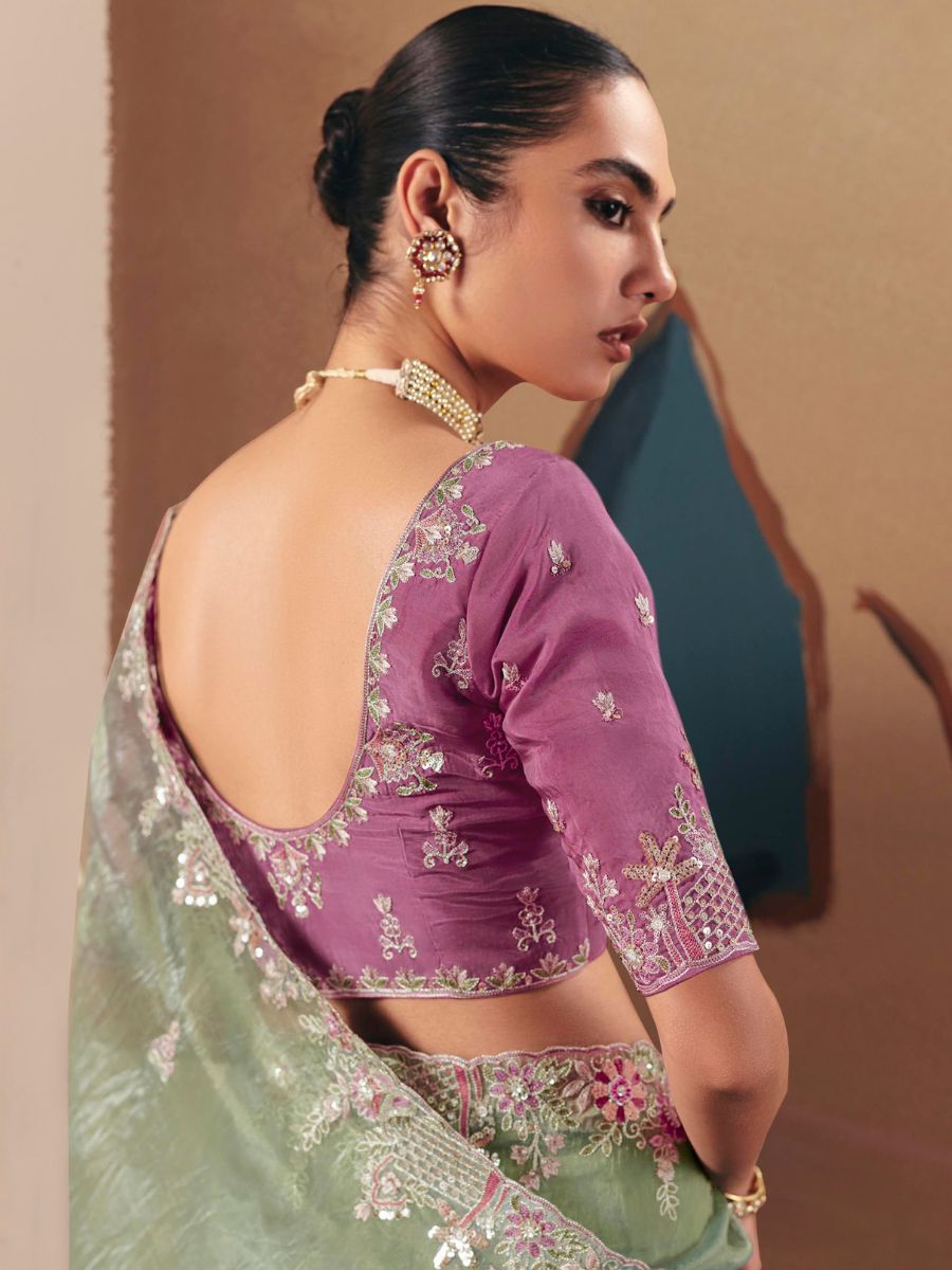 - Light Green Fancy Fabric Saree with Thread & Sequin Work and Purple Blouse
