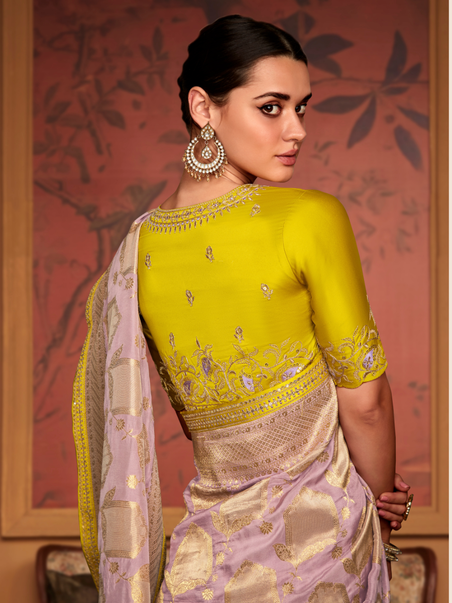 The saree comes with a contrast yellow blouse that has lovely embroidery work on the neckline and sleeves. The contrast blouse adds a stylish twist and makes the saree stand out even more. The blouse design suits both traditional and modern styling.