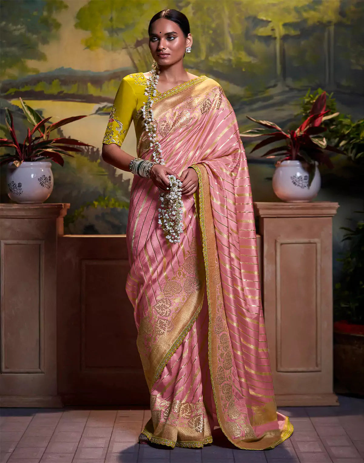 - Light Pink Pure Dola Silk Saree With Fancy Lace Border and Embroidery Work Blouse