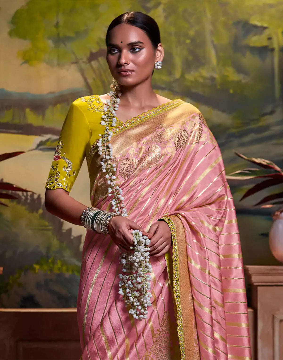 Pair it with gold or pearl jewelry, bangles and heels to complete your festive and occasion-ready look. If you are searching for a saree that looks rich, stylish and timeless, this light pink Dola silk saree is a great choice.