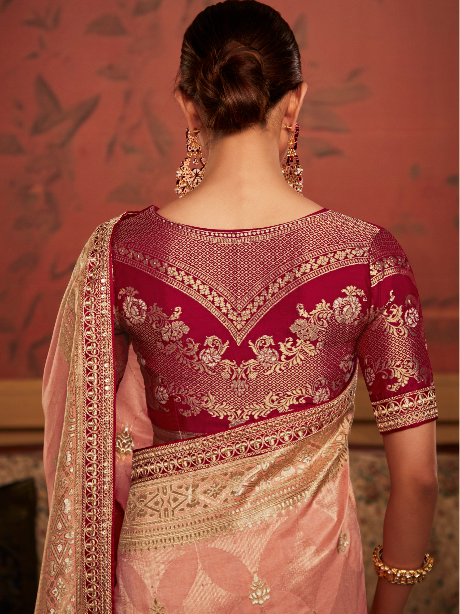 Blouse: The blouse is a rich, deep maroon color, which provides a striking contrast to the pale pink of the saree. The back of the blouse, visible in one of the images, shows a prominent golden zari brocade design that mirrors the motifs on the saree's border. The blouse has short sleeves, also with a patterned border.