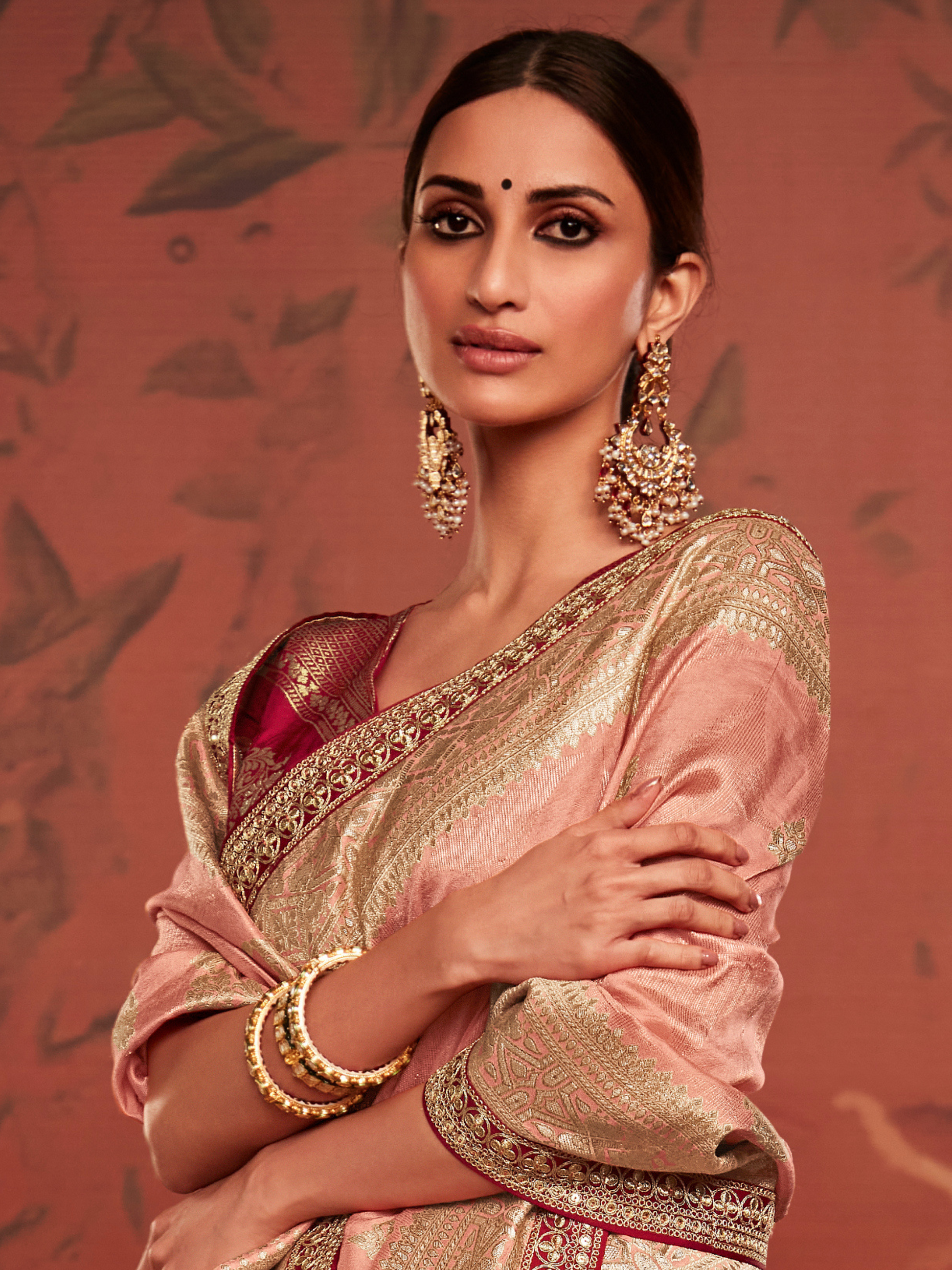 The saree is a delicate, light pink or blush color with a glossy finish, likely indicating a silk blend or tissue silk fabric. It is woven with a detailed gold zari pattern that includes small motifs on the body and more elaborate designs on the border and pallu