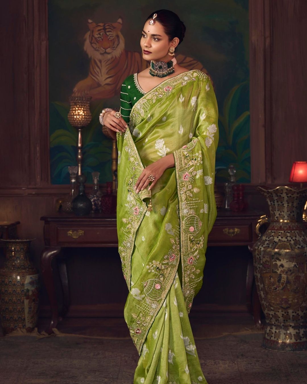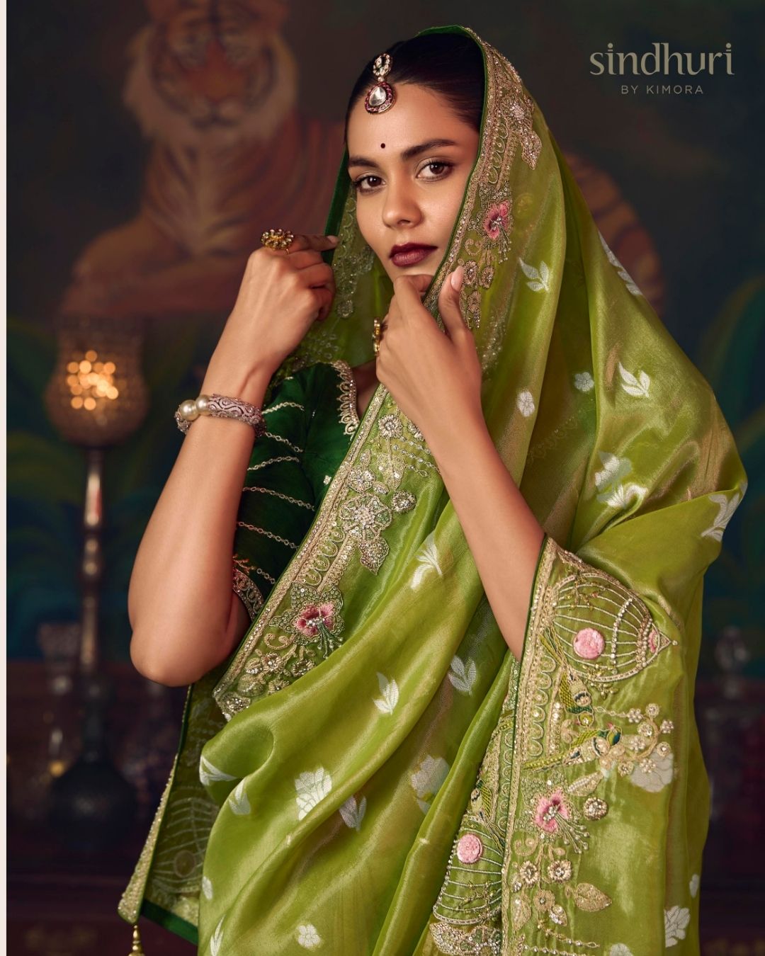 Make a royal statement with this stunning olive green silk saree, crafted with exceptional detailing and elegant finishing. The saree features delicate zari woven motifs along with beautifully hand-embroidered borders using thread work, sequins, pearls and stone embellishments—giving it a luxurious festive touch.