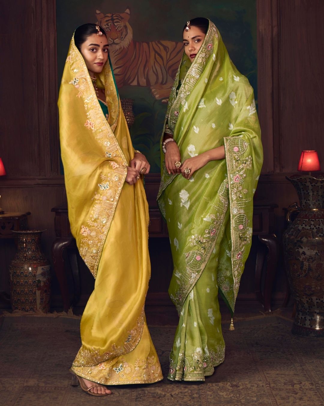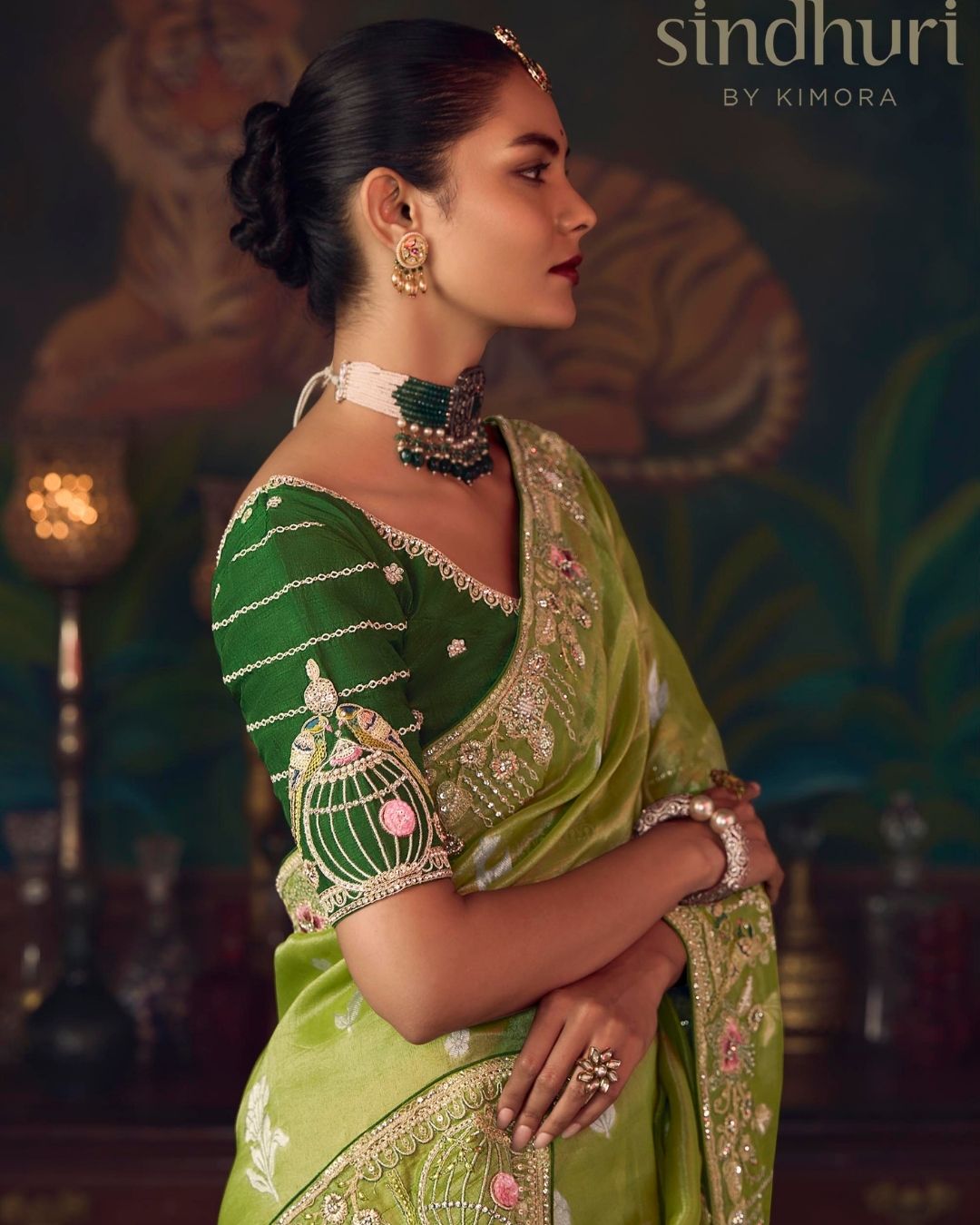 Paired with a rich contrast dark green blouse highlighted with embroidery and cage-motif sleeve detailing, this ensemble brings a unique blend of heritage craft and modern couture styling.
