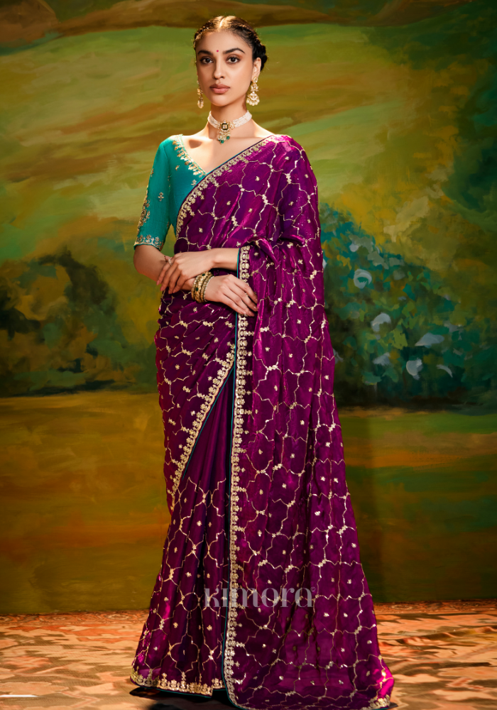 This wine color heavy tissue silk saree has a smooth and rich feel, making it suitable for special occasions. The saree is detailed with sequence golden embroidery that adds a soft shine and gives a clean festive look. The deep wine shade looks strong and stylish, perfect for weddings, receptions, and evening functions.