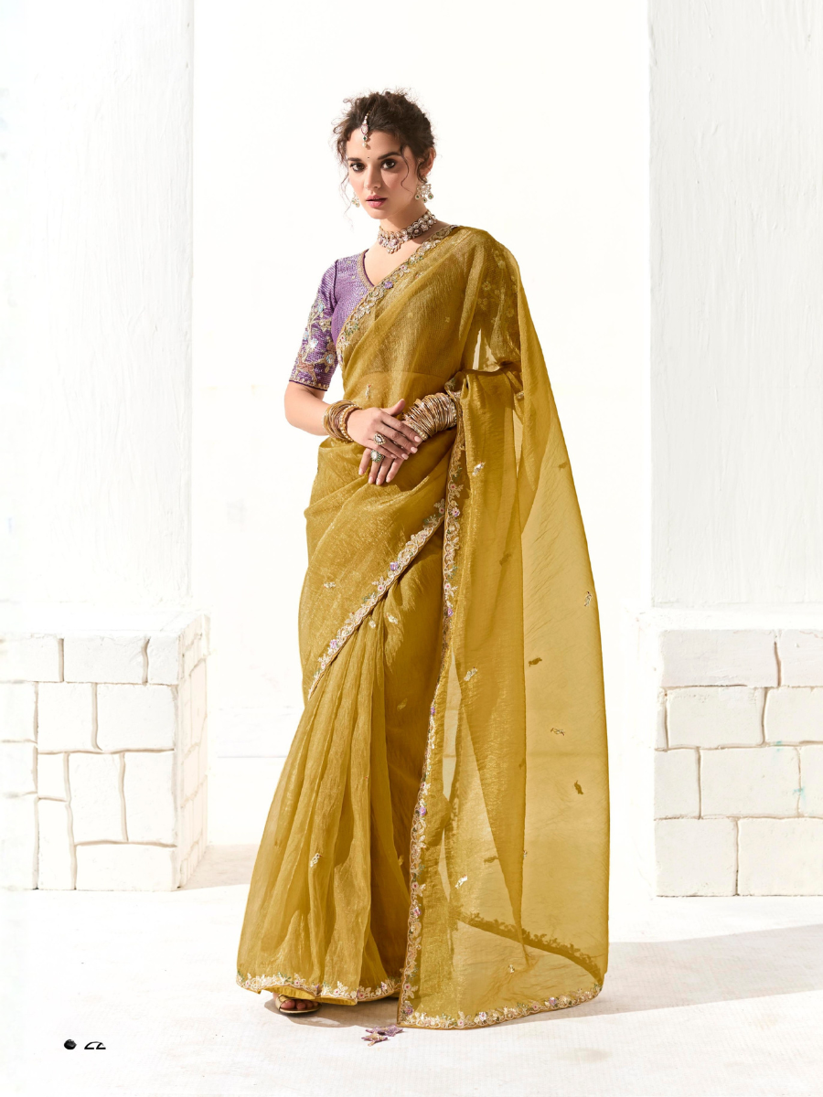 Mustard Tissue Silk Saree with Sequin Embellishments & Purple Embroidered Blouse
