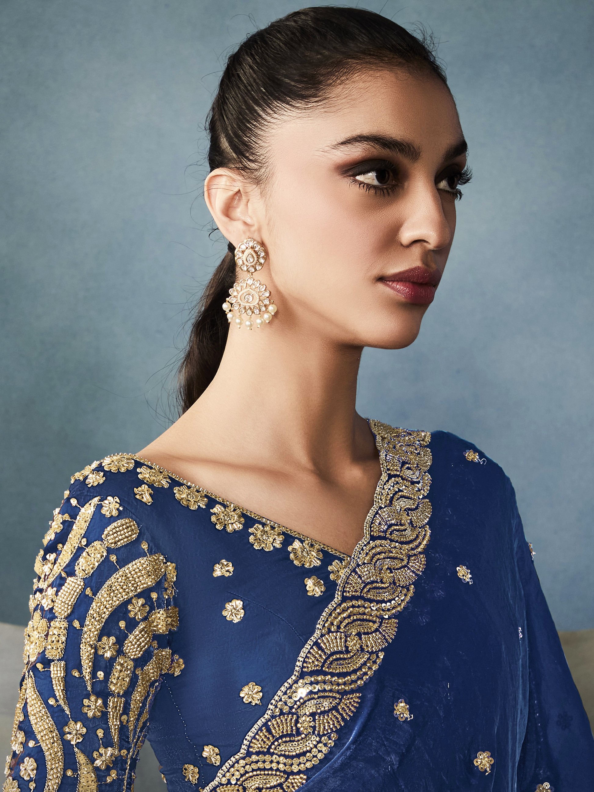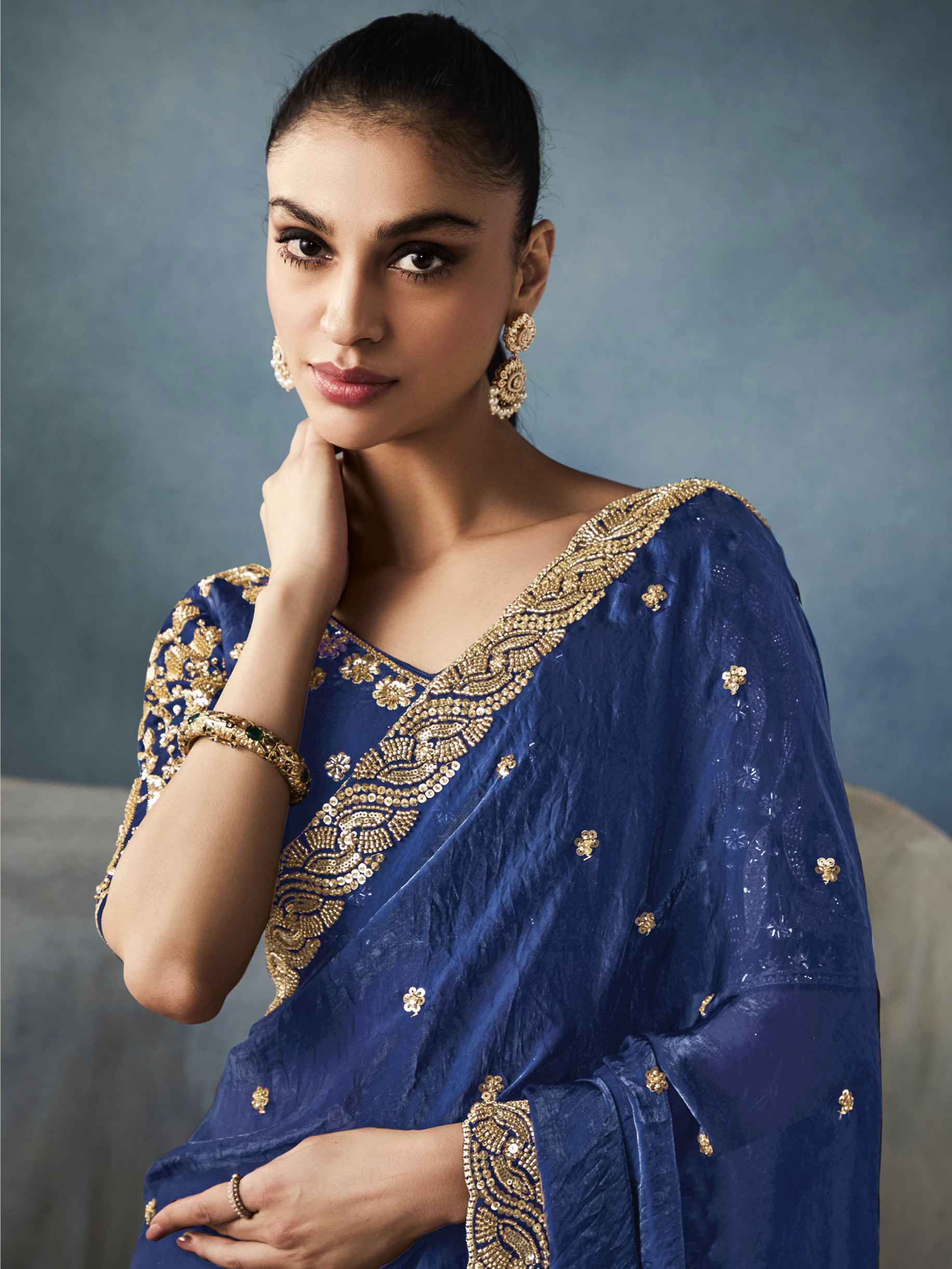 - Navy Blue Tissue Embroidered Fancy Heavy Border Saree
