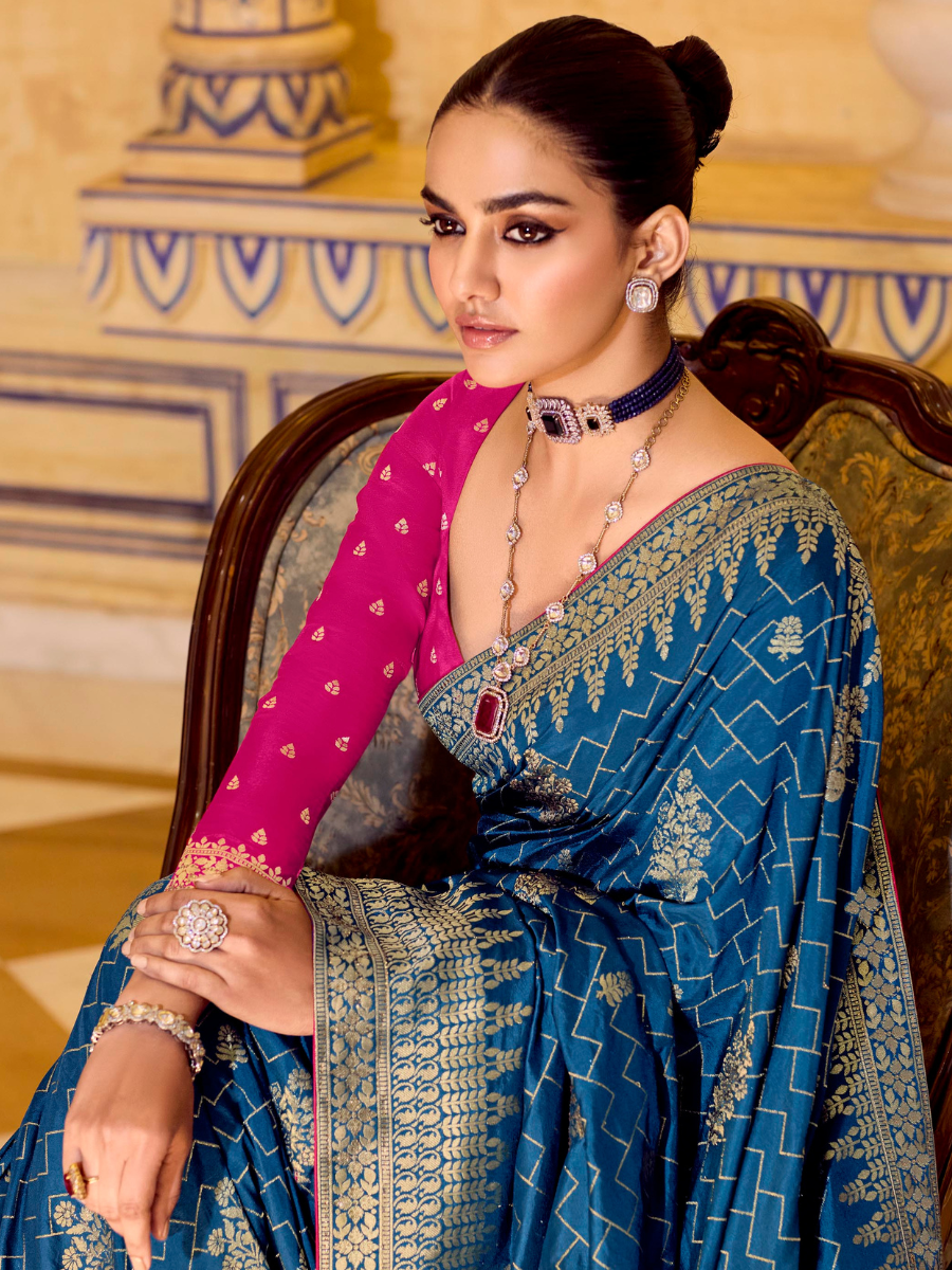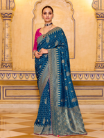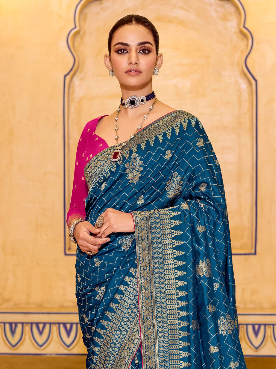 This soft silk saree tells a story of classic Indian craft mixed with bold color contrast. The deep teal blue base is decorated with golden Banarasi weaving that flows beautifully across the saree, creating a rich and festive look. Swarovski work adds a soft shine that catches light gently, making the saree stand out without looking heavy. The fabric feels smooth and light, so it drapes well and stays comfortable for long wedding or festive hours.
