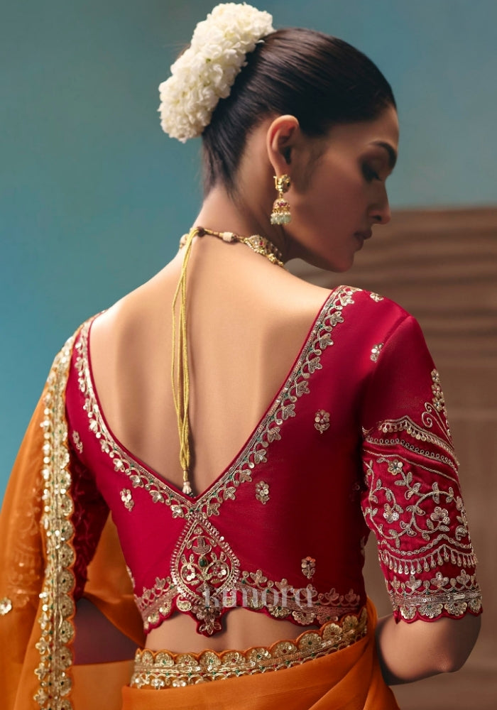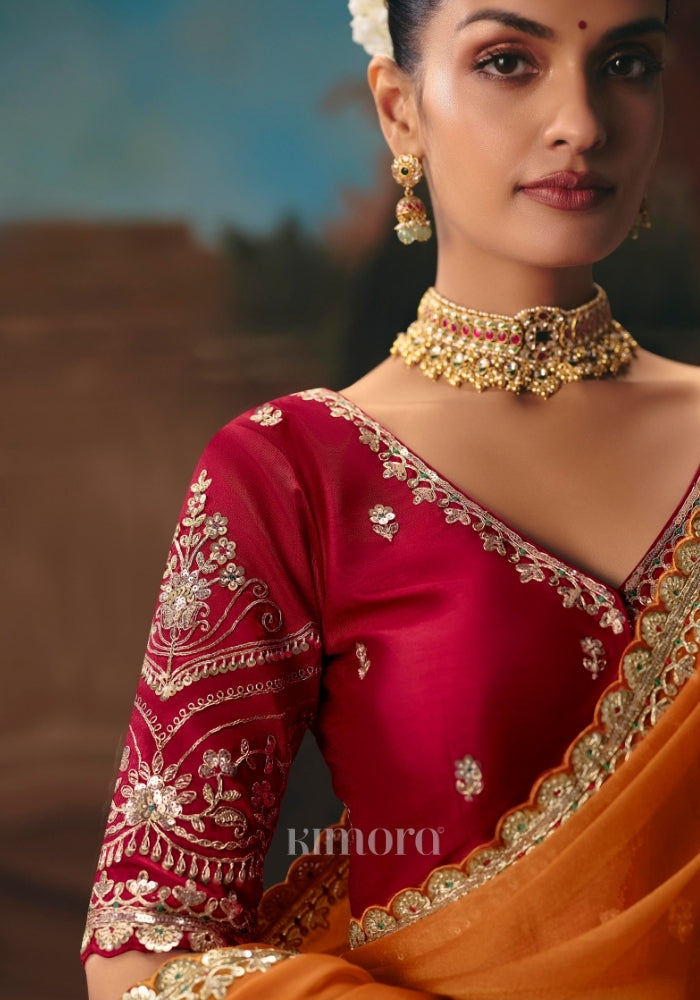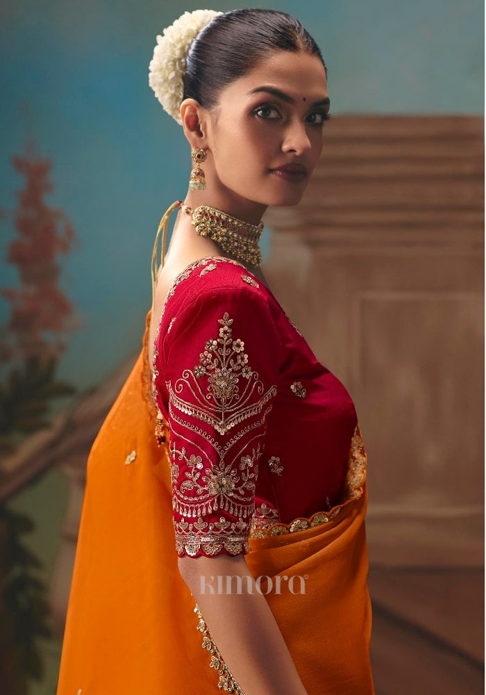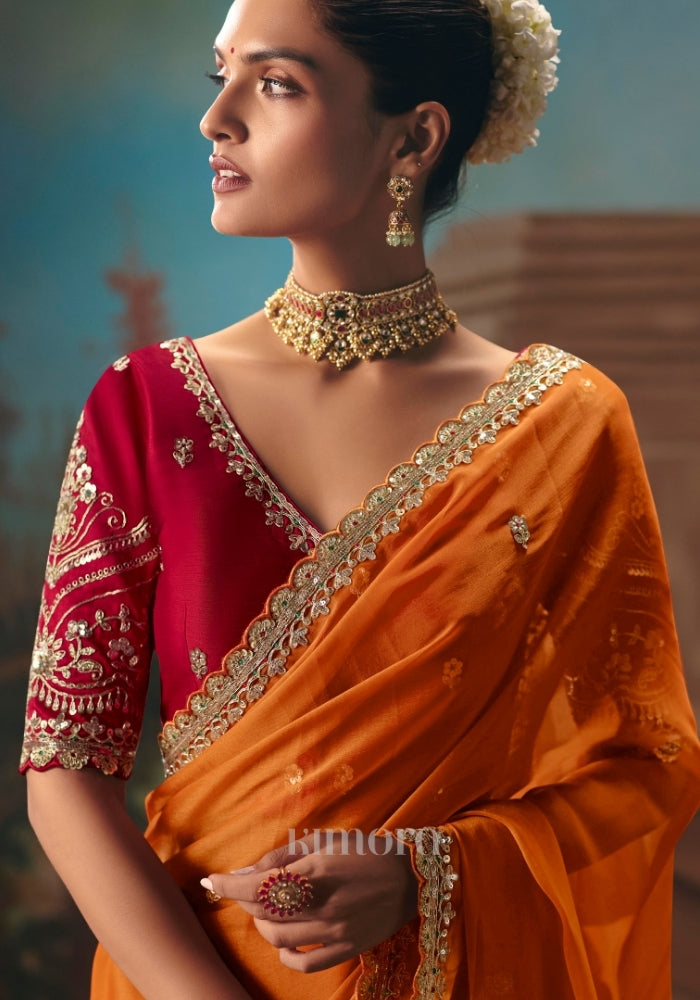 Drape yourself in timeless elegance with this exquisite Peel Orange saree, crafted for women who love statement luxury. The rich, vibrant hue beautifully enhances every skin tone, while the intricate detailing makes it perfect for weddings, receptions, festive occasions, and grand celebrations. The saree is adorned with heavy resham embroidery, delicate silver thread work, and intricate multi-sequin dhaga detailing, creating a refined shimmer with every movement. The body is enhanced with scattered butti work and fine zari accents, adding depth and richness throughout the drape. Its highlight is the scalloped designer embroidered border, lavishly detailed with sequins, stones, and heavy beadwork. The border flows gracefully along the pallu and hemline, giving the saree a royal finish and a couture-inspired look. Paired with a premium satin silk red blouse, this ensemble perfectly balances vibrance and sophistication. The blouse features heavy all-over embroidery on the front, back, and sleeves, thoughtfully designed to complement the saree’s intricate border and overall grandeur.