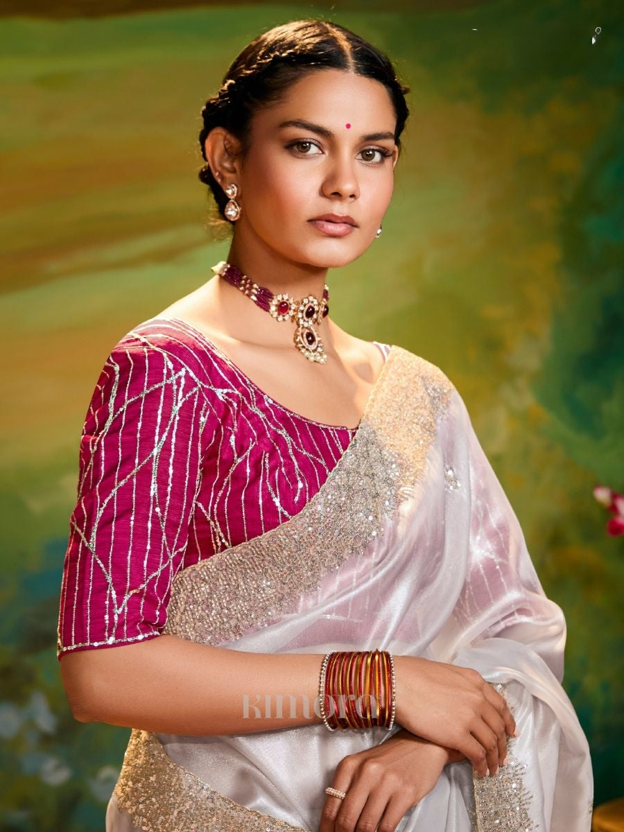 - Off-White Organza Saree with Red Blouse