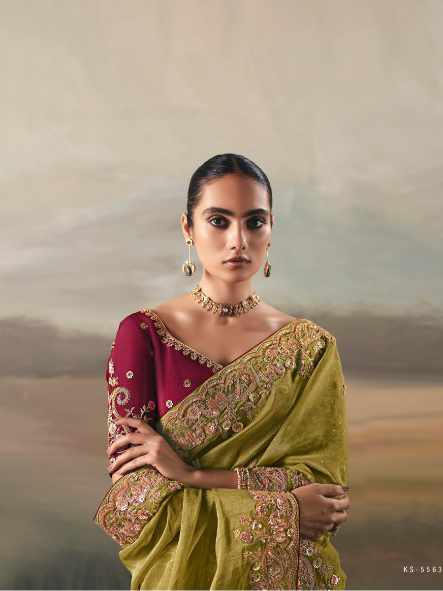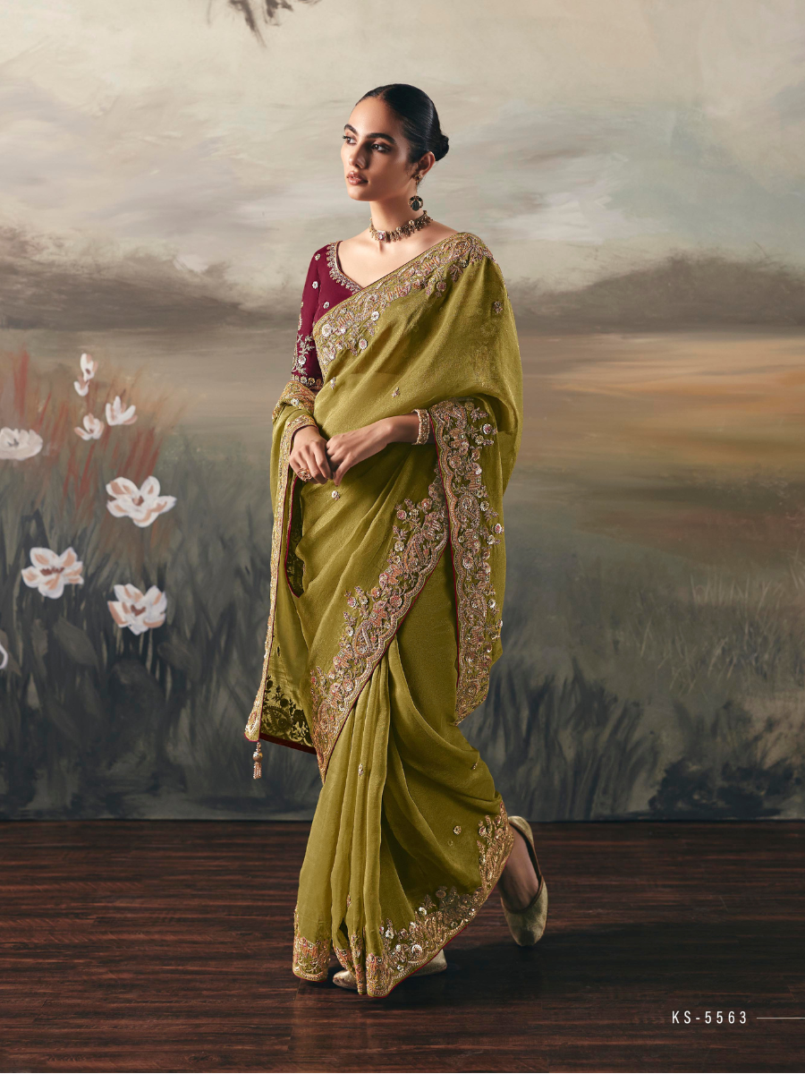 Olive Green Art Silk Saree with Embroidered Border and Maroon Blouse