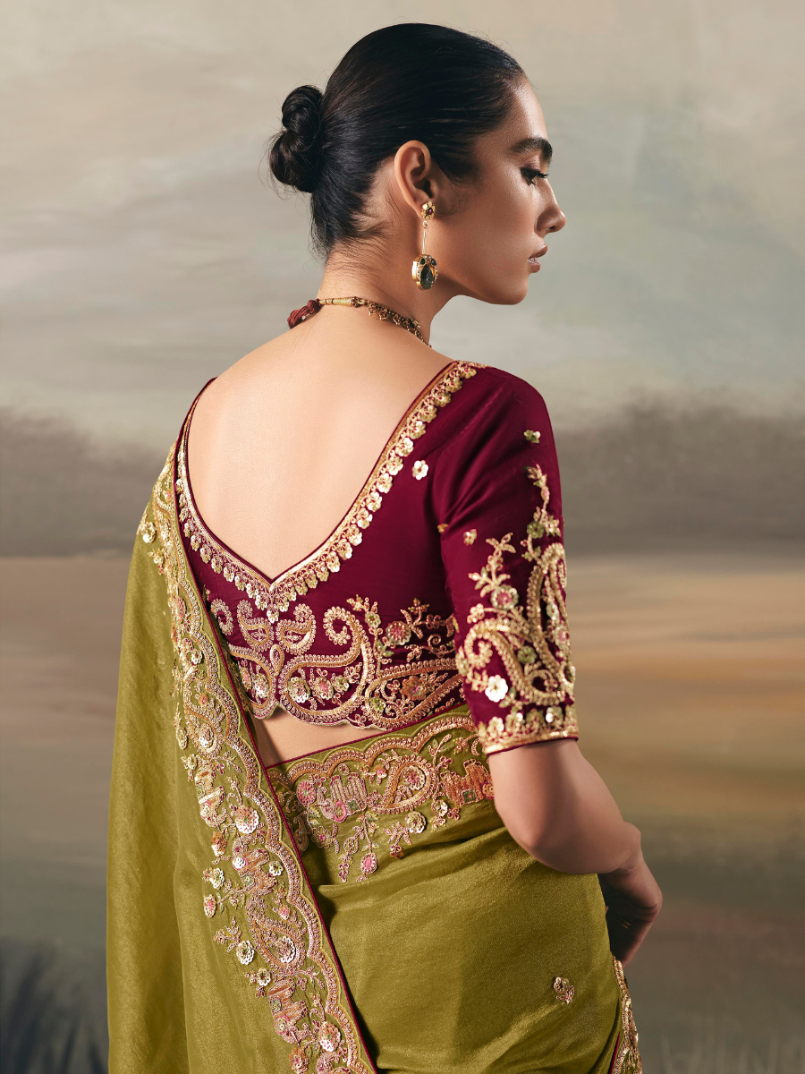 - Olive Green Art Silk Saree with Embroidered Border and Maroon Blouse