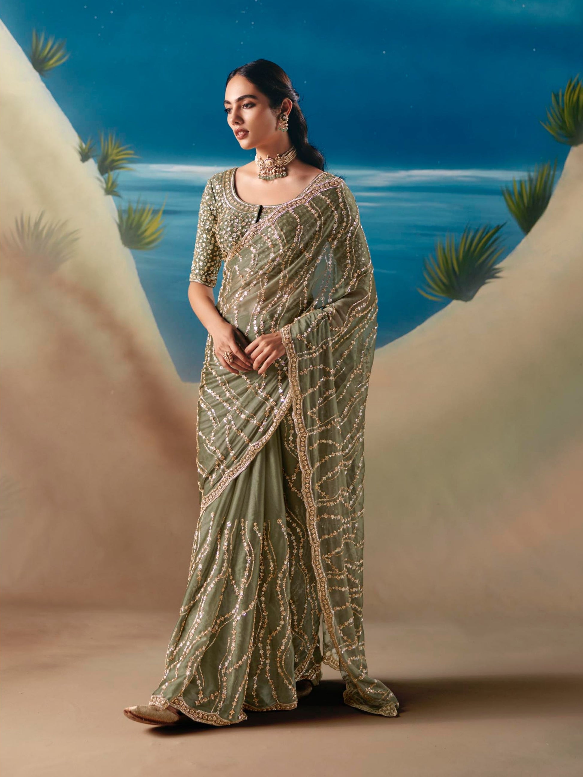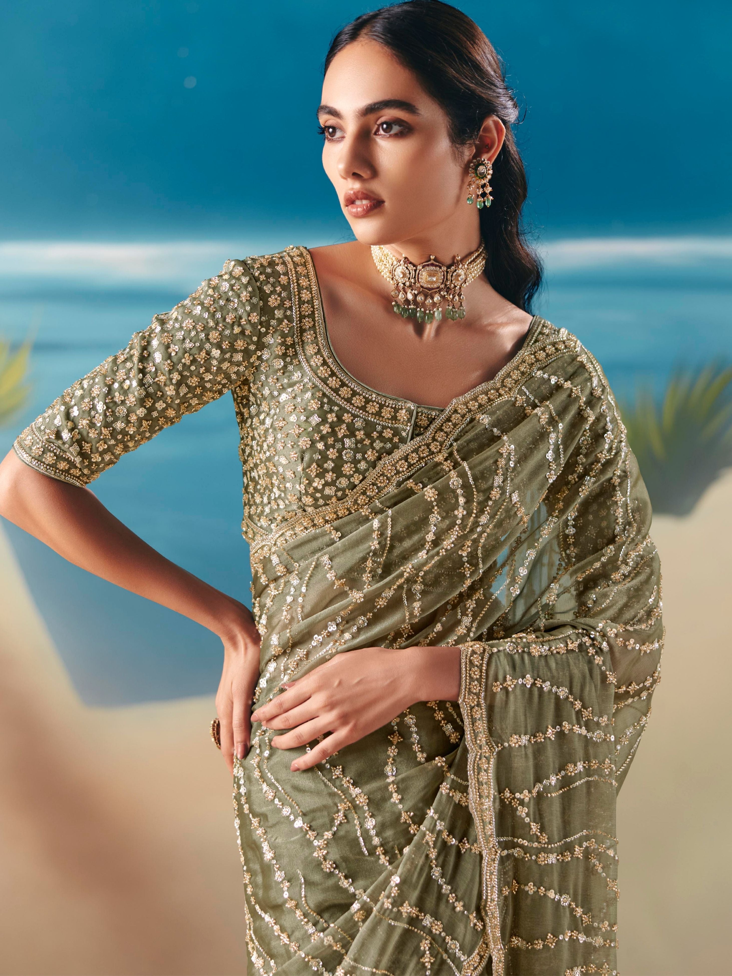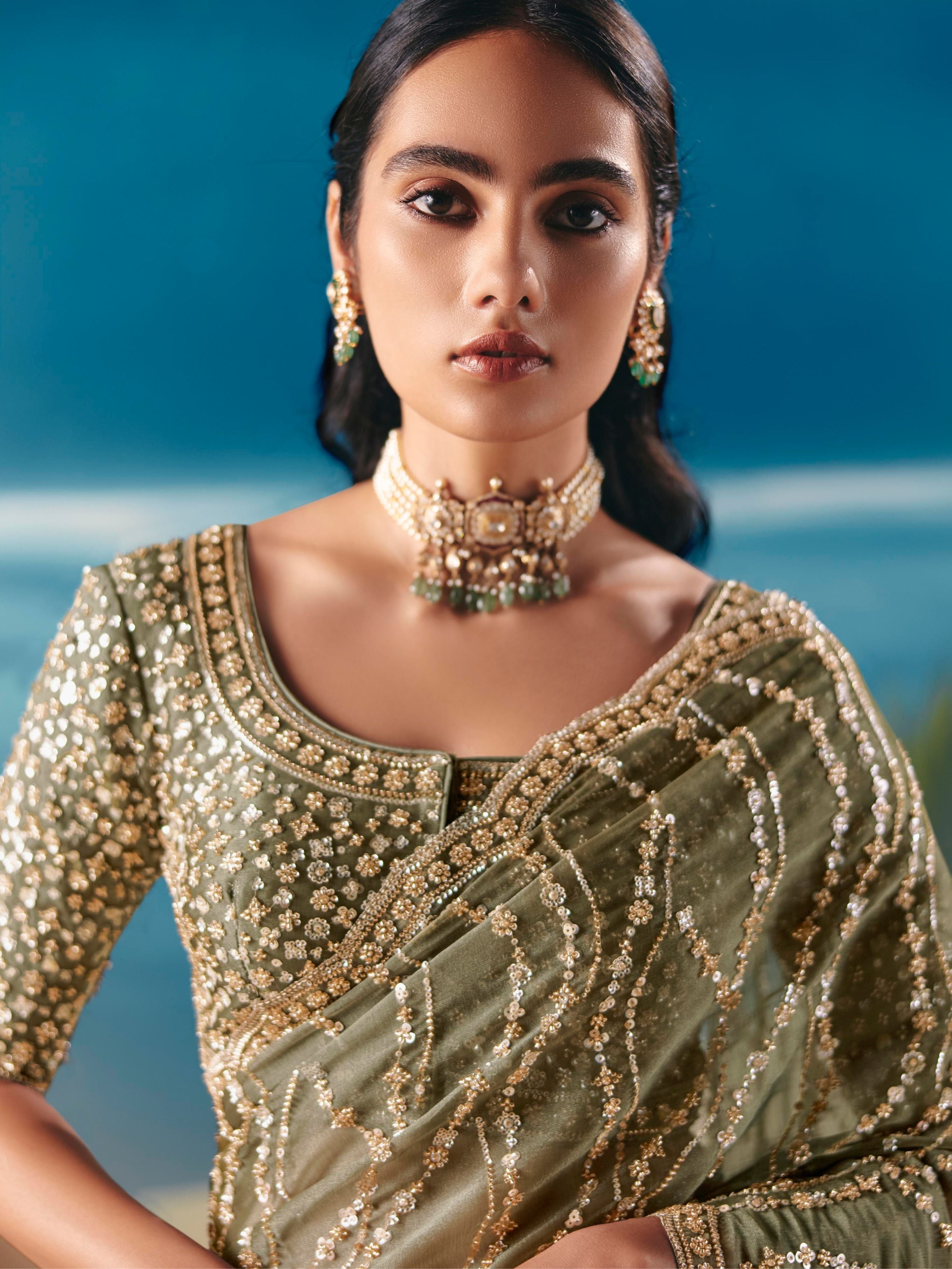 Olive Green Organza Tissue Silk Hand Embroidered Bridal Saree