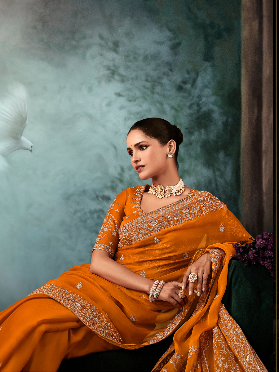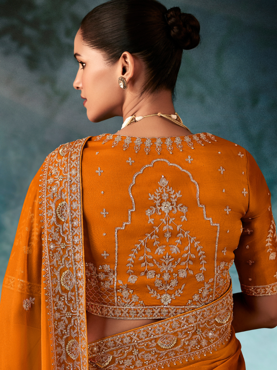 The matching blouse is also made from Fancy Silk fabric in orange color. It has full embroidery on the front, sleeves, and back. The back of the blouse features a large floral design with fine thread work, making it stand out. The blouse has short sleeves with detailed embroidery and a simple neckline.