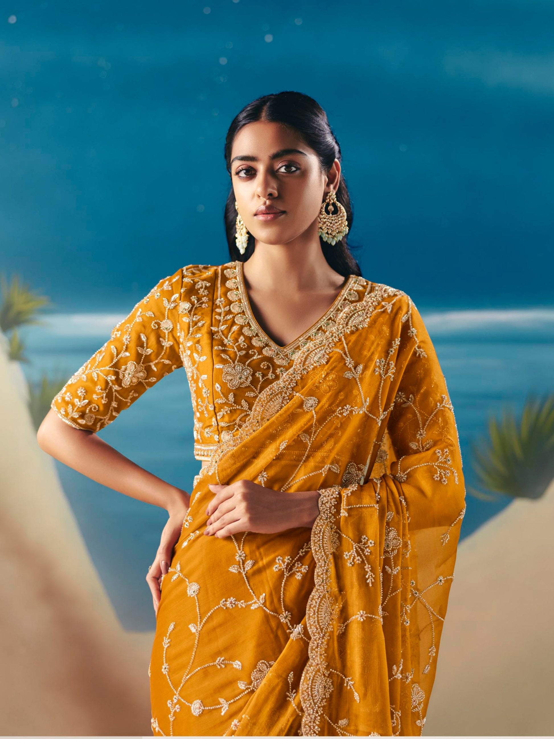 Haldi yellow silk organza saree is richly detailed with dense beads, cutdana, tilla