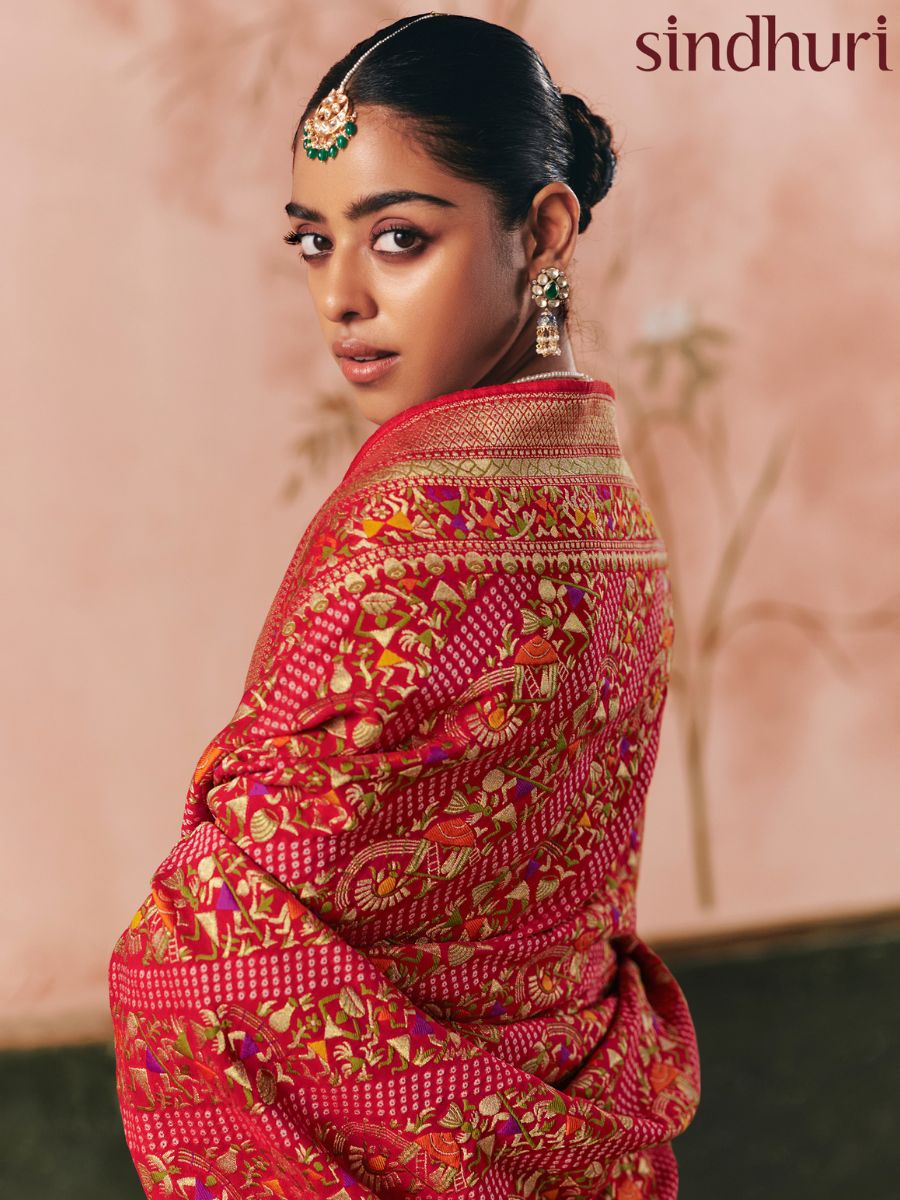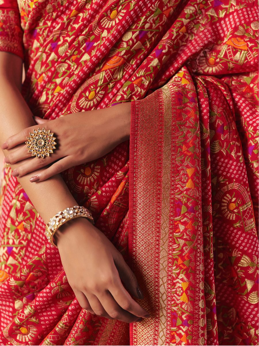 A rich red saree with a blend of Bandhani essence ,in a georgette fabric which