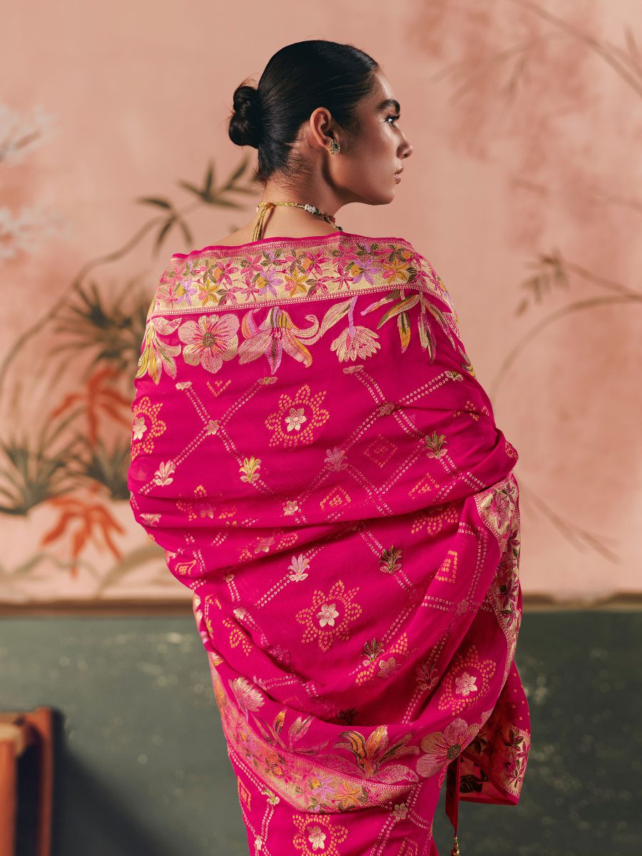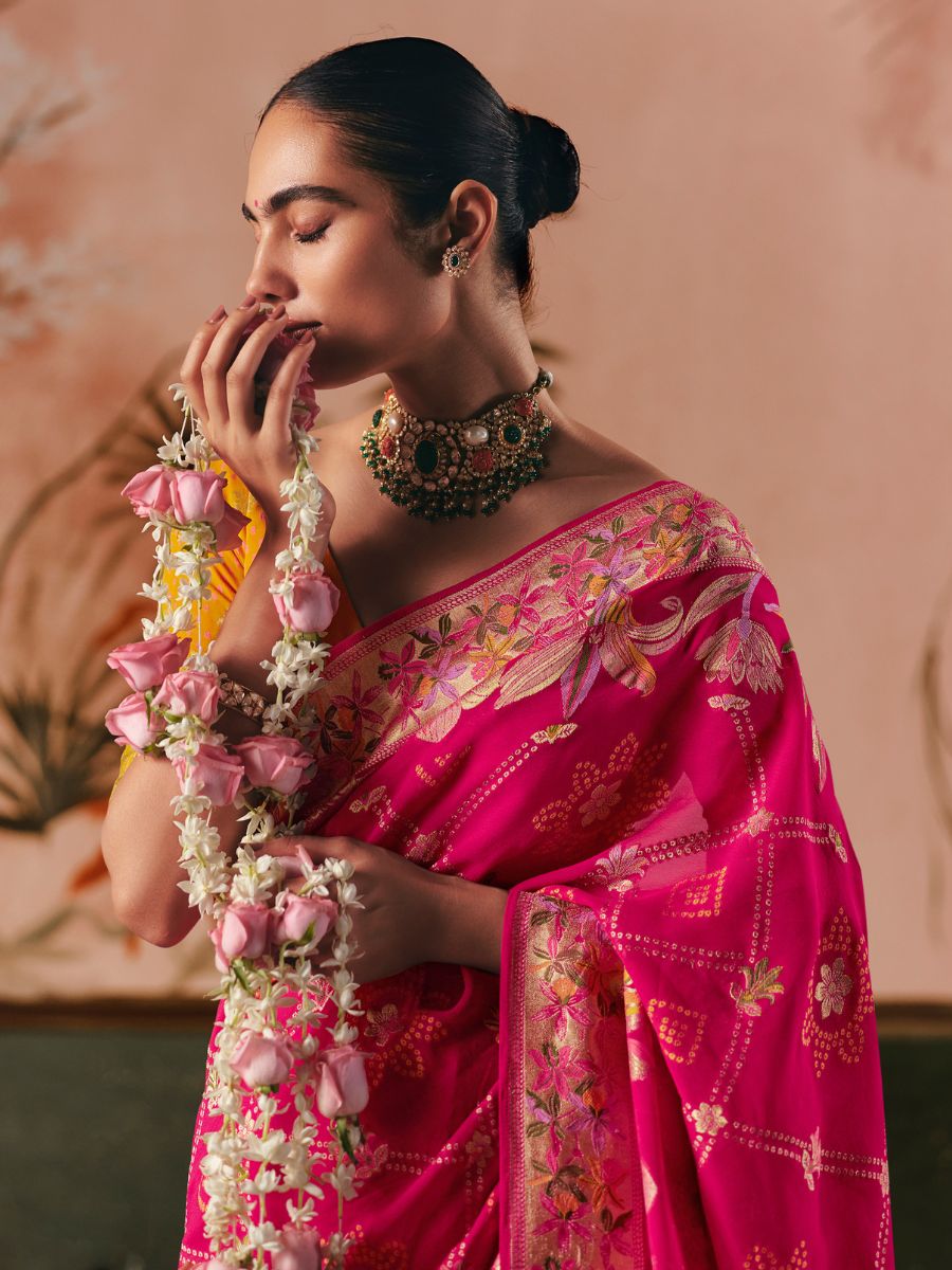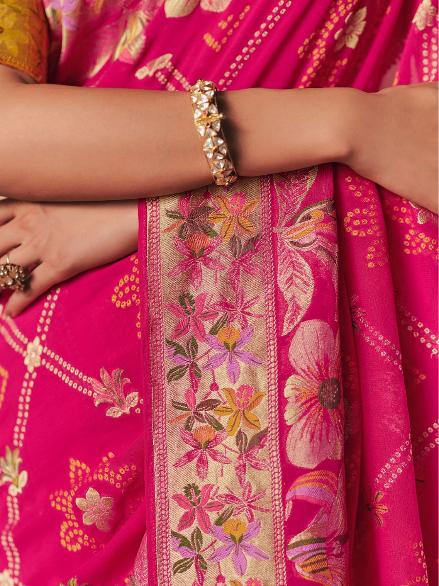Presenting a stunning Pure Georgette Bandhani Saree in a vibrant pink hue—crafted with precision, tradition and fine artistry. The saree features authentic Bandhani hand-tied detailing, creating delicate dotted patterns across the body.