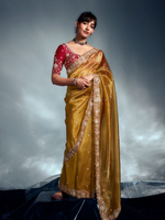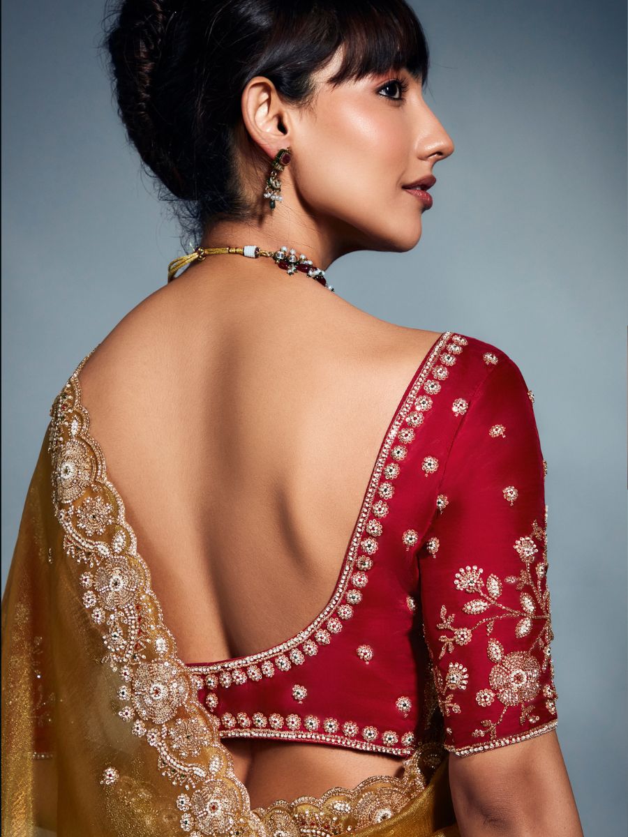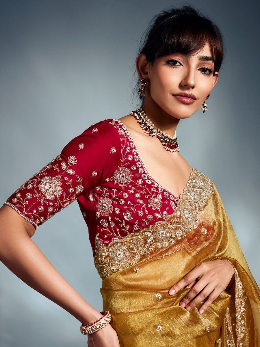This saree is made from pure organza fabric, giving it a light and soft feel. It comes in a rich golden shade with small butis all over and a detailed embroidered border. The blouse has beautiful embroidery in a contrasting color, adding a stylish touch. Perfect for weddings, functions, and festive wear.