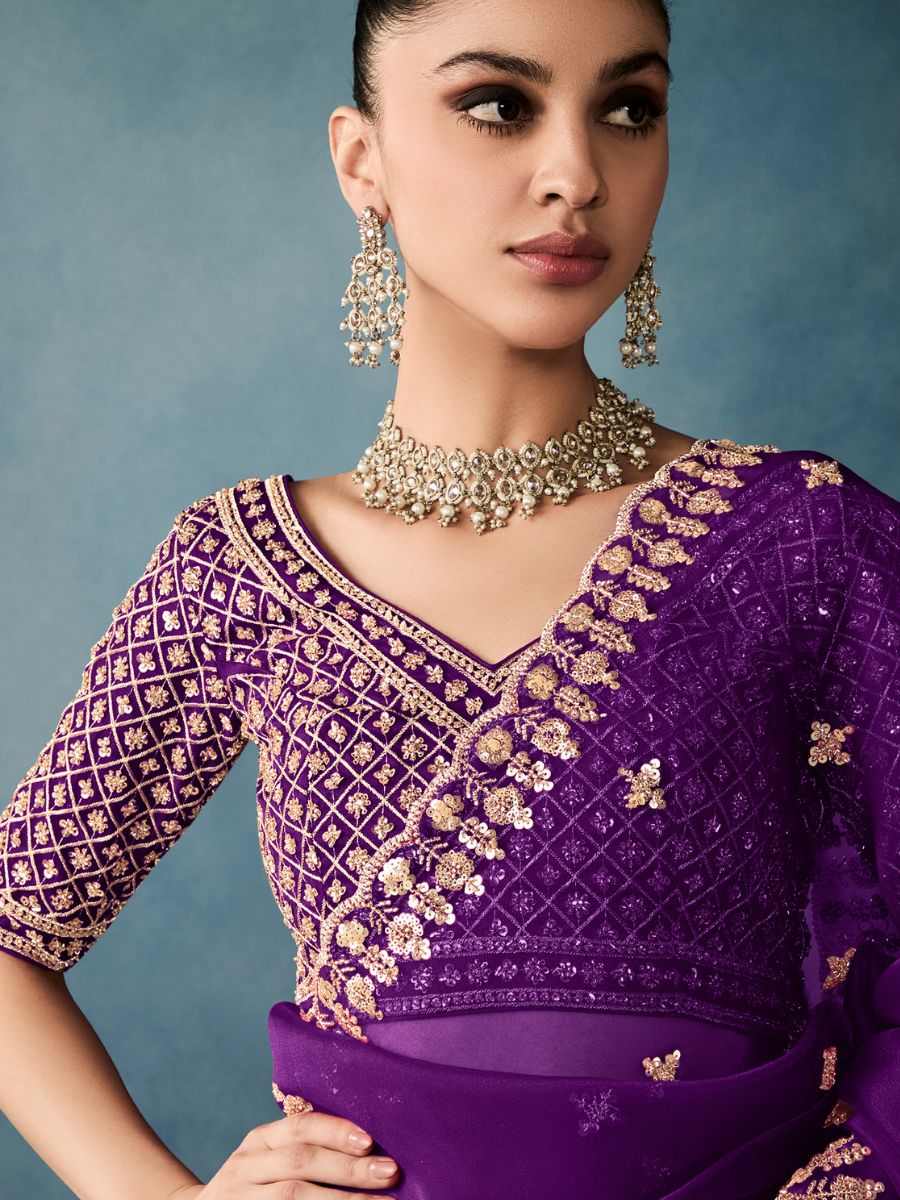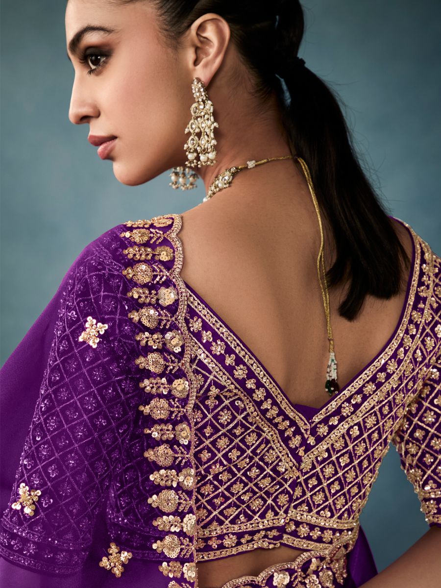 This purple saree is made from soft georgette fabric and comes with beautiful golden embroidery. The saree feels light to wear and easy to drape. The blouse has heavy work on front and back, making it look premium and stylish.