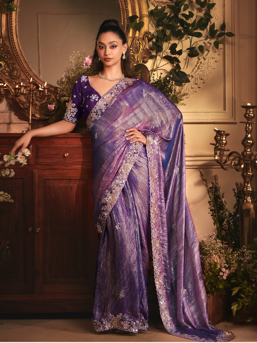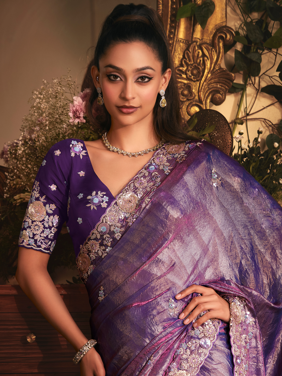 It comes with a matching purple blouse piece with embroidery on sleeves, which completes the full set. This saree is suitable for weddings, receptions, festive events, parties, and special family functions.