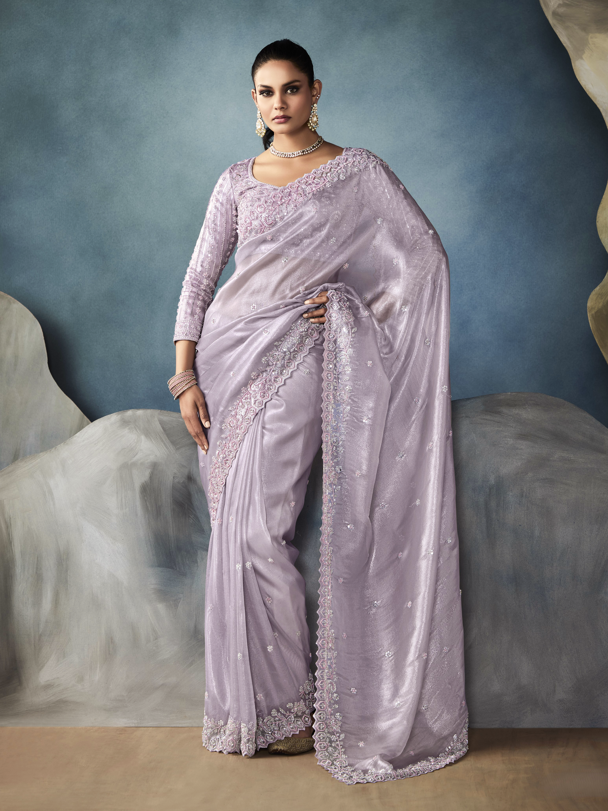 Turn heads at any celebration with our Purple Tissue Silk Saree, a rich and royal drape designed for grand occasions. The luxurious tissue silk fabric is beautifully detailed with heavy embroidery work, giving it a regal look that shines at weddings, receptions, and festive events.