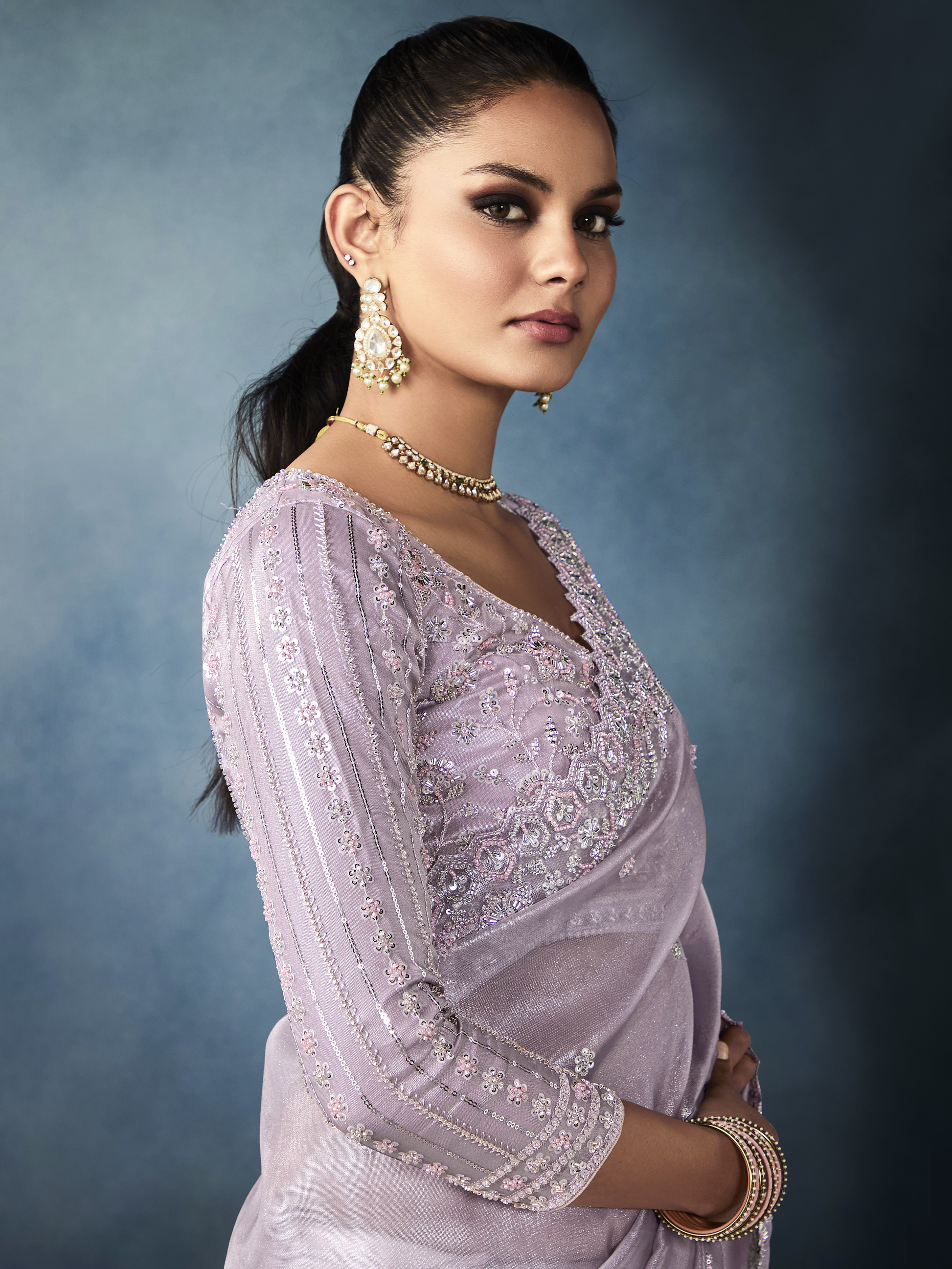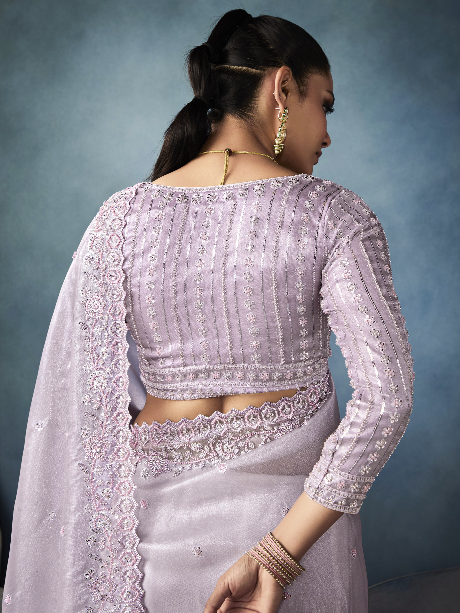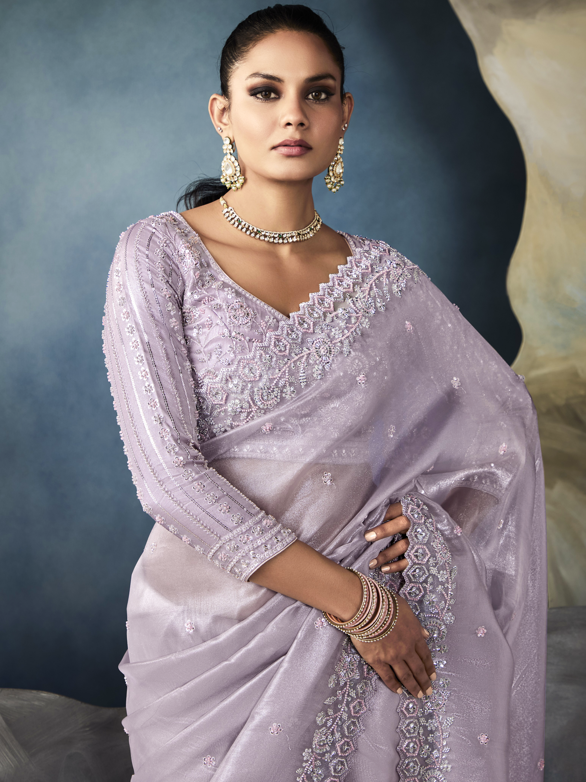 Purple Tissue Silk Saree with Heavy Embroidery and Matching Satin Blouse