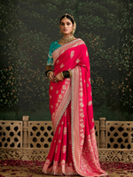 - Red Banarasi Dola Silk Saree With Golden Zari Work