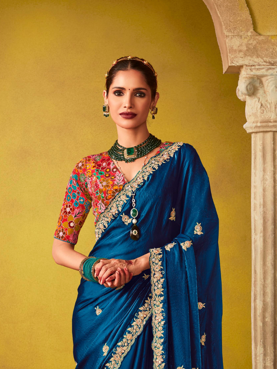 - Royal Blue Tissue Silk Saree with Embroidered Border and Contrast Floral Blouse